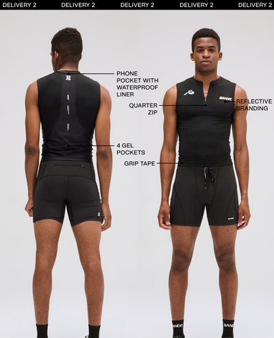 Introducing our Pieced Sleeveless Quarter Zip in our Ares Flex performance fabric. This sleeveless, fitted silhouette is perfect for warm temperatures and training runs, boasting a phone pocket at center back neck and 4 gel pockets at back body. This community sourced style is printed with our seasonal collection gradient with solid blocking.