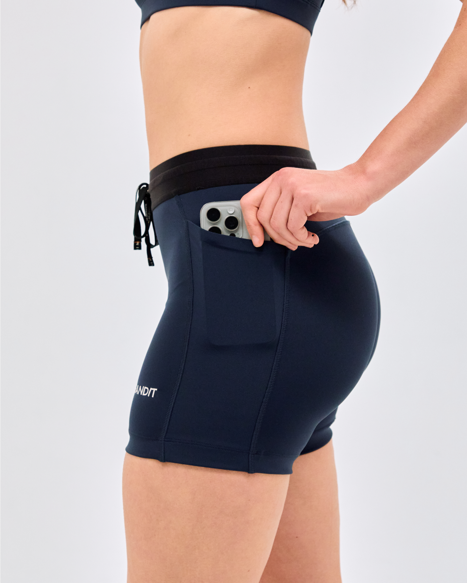 Multiple pockets, zero telling. Sweat-proof phone and gel-sized pockets all designed to disappear when you run.