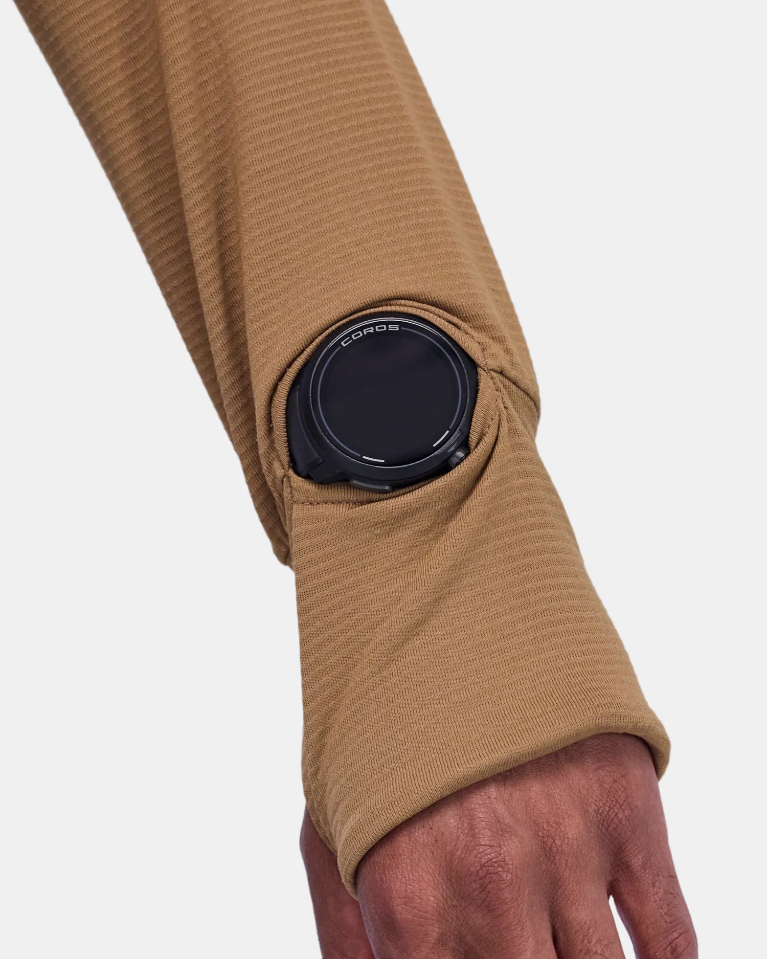 The relaxed fit of this layering piece has all of the attitude of your favorite long sleeve cotton tee, while still having the element of performance. The baby mock neckline and merrow stitched design lines echo our singlet, adding novelty and textural interest. Updated with thumbholes, handwarmer pockets (hand warmers included), level up the performance aspect of this style.