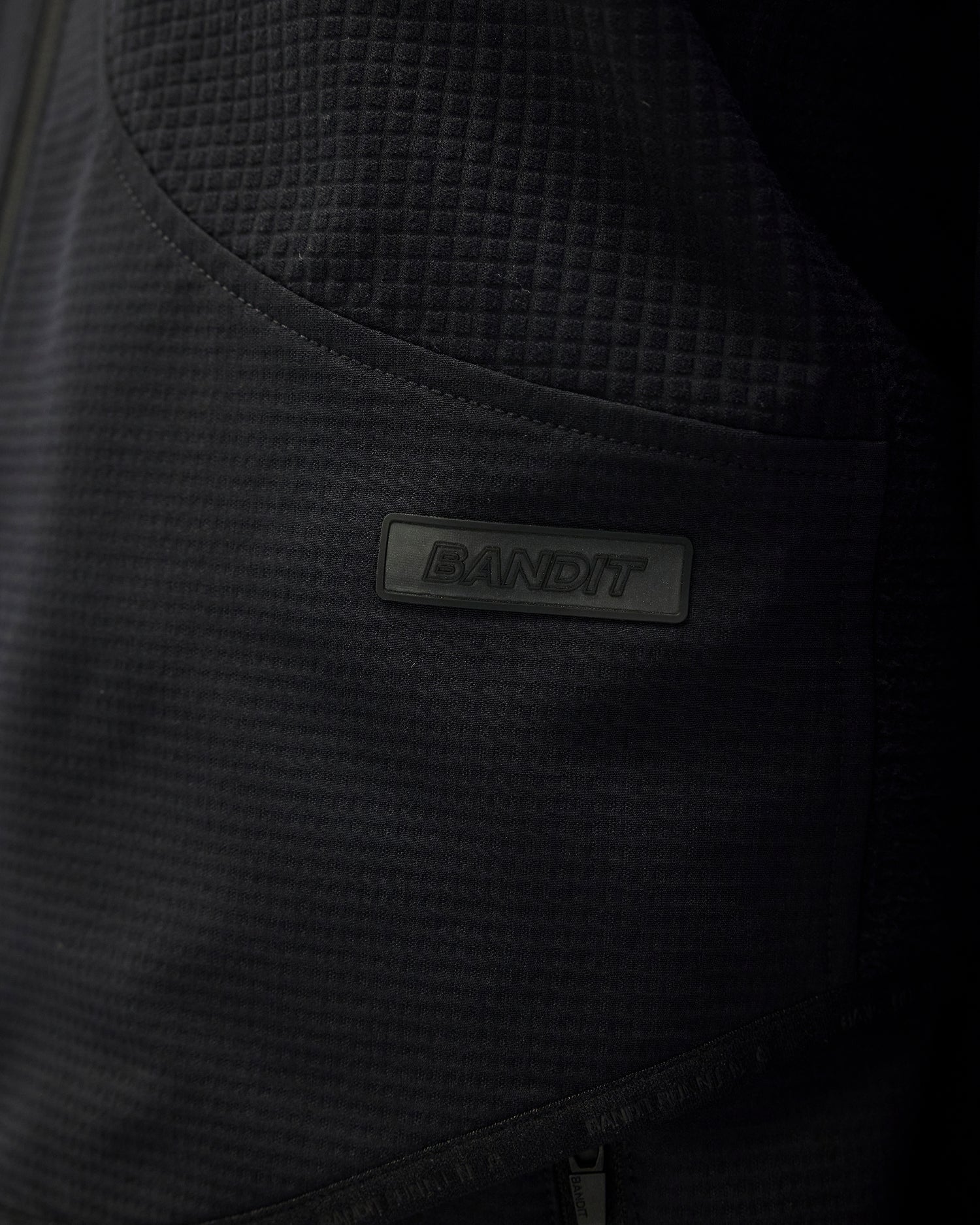 Details include vent at front and back body for ventilation, front zipper pockets that is perfect to stash your phone, keys, and gels. Elastic binding at hem, vent, and sleeve openings as well as a high collar help to keep you comfortable. Subtle texture is added by using the reverse side of the fabric at top body panels, side body, and underarm panels.