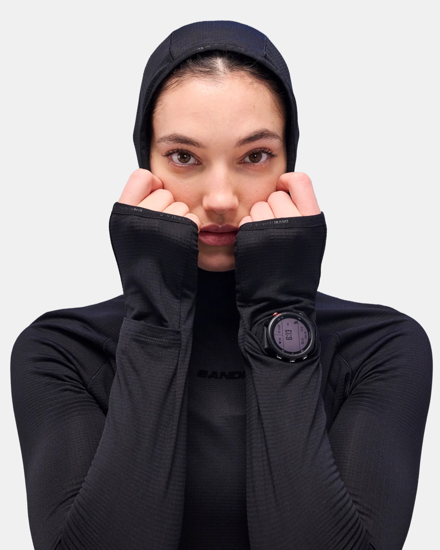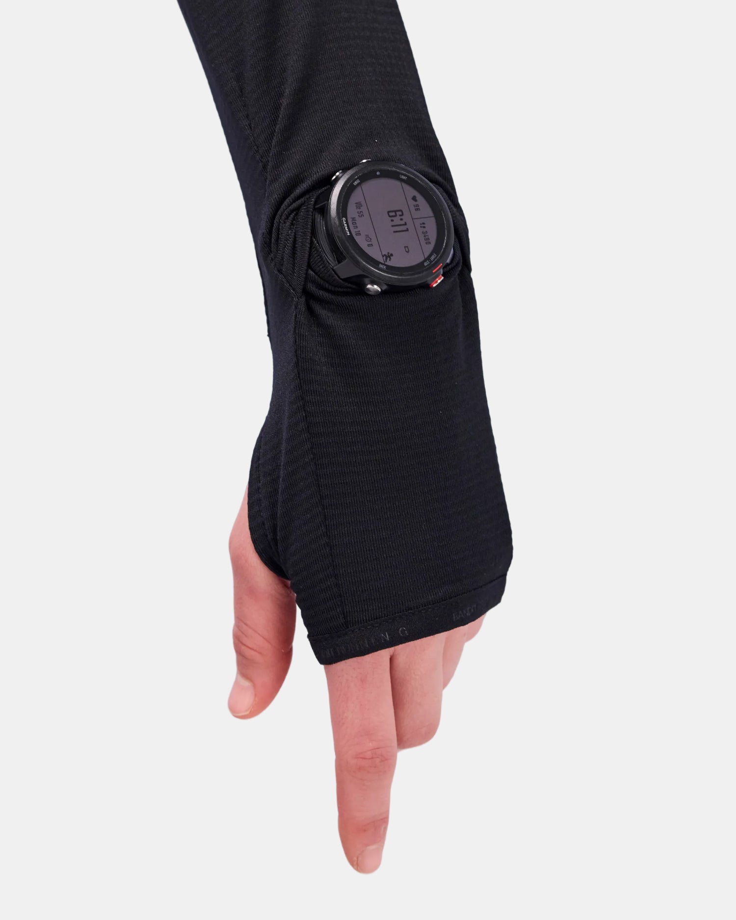 Perfect as a base layer or on its own, this fitted style includes a hood finished with branded elastic binding. Additional details include thumbholes, watch window, internal hand warmer pockets (hand warmers included), and flocked graphic hits at center front and center back. Complete with merrow stitching at armhole & body seams adding textural interest.