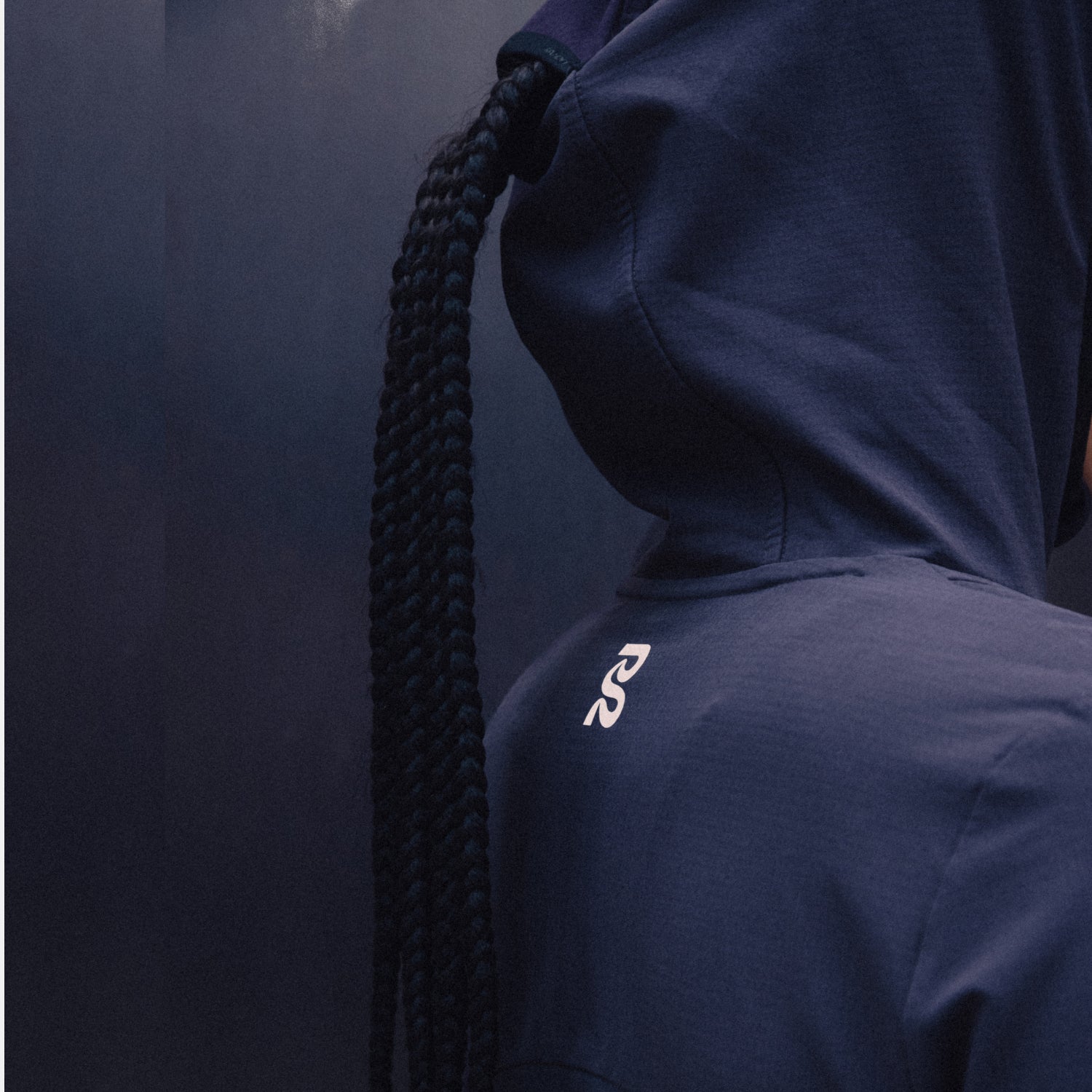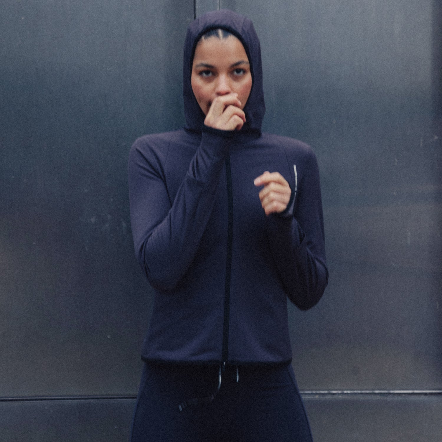 Details include front zipper pockets that is perfect to stash your phone, keys, and gels. Branded elastic binding at hem, sleeve openings, ponytail window and hood help to provide the perfect fit. Our branded 2 way zipper at center front provides additional mobility and versatility, while the watch window and thumbhole combo at sleeve provides easy access to your watch when tracking splits during any workout.