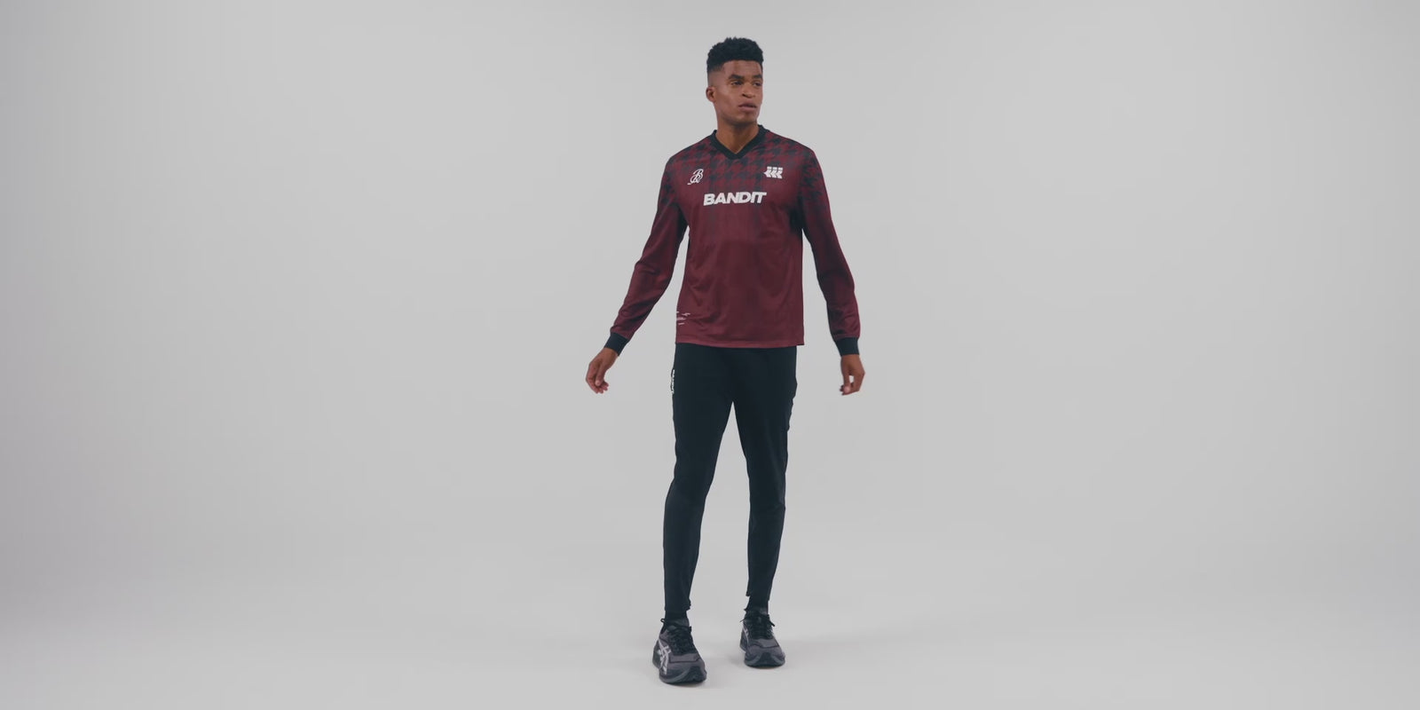 (Note: Video may render dark. Actual color below.) Introducing our Jacquard Footy Long Sleeve in Bandit Cheque™. Flat knit rib trim at cuff and V-neckline. Limited edition Fall '25 print with subtle stripe and gradient houndstooth pattern. Contrast branded hits at front and back body.