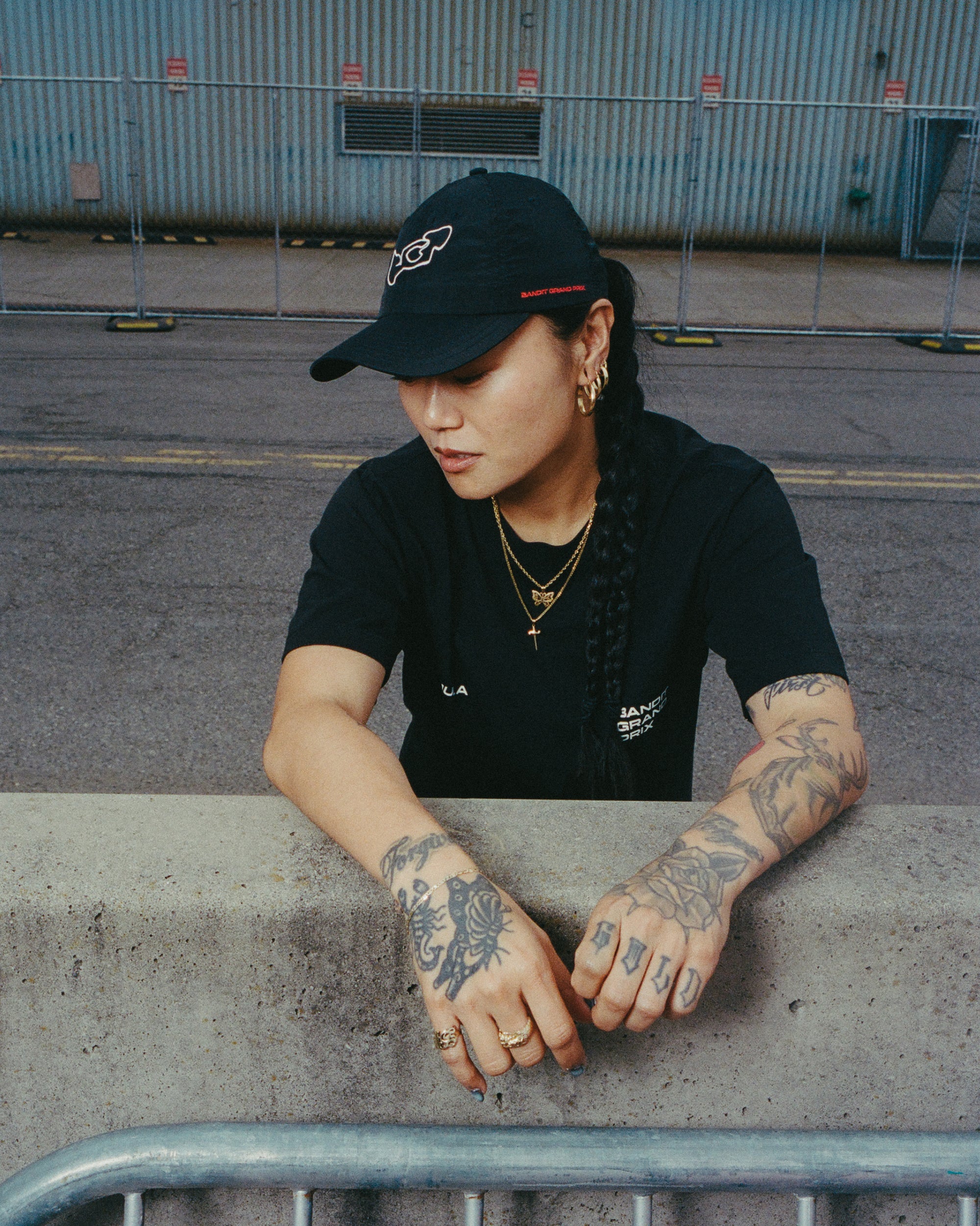 The Bandit Grand Prix "Formula Run" Cotton Tee features multiple graphic hits including large concentric track ovals forming a sound wave representing the sonic nature of the event.
