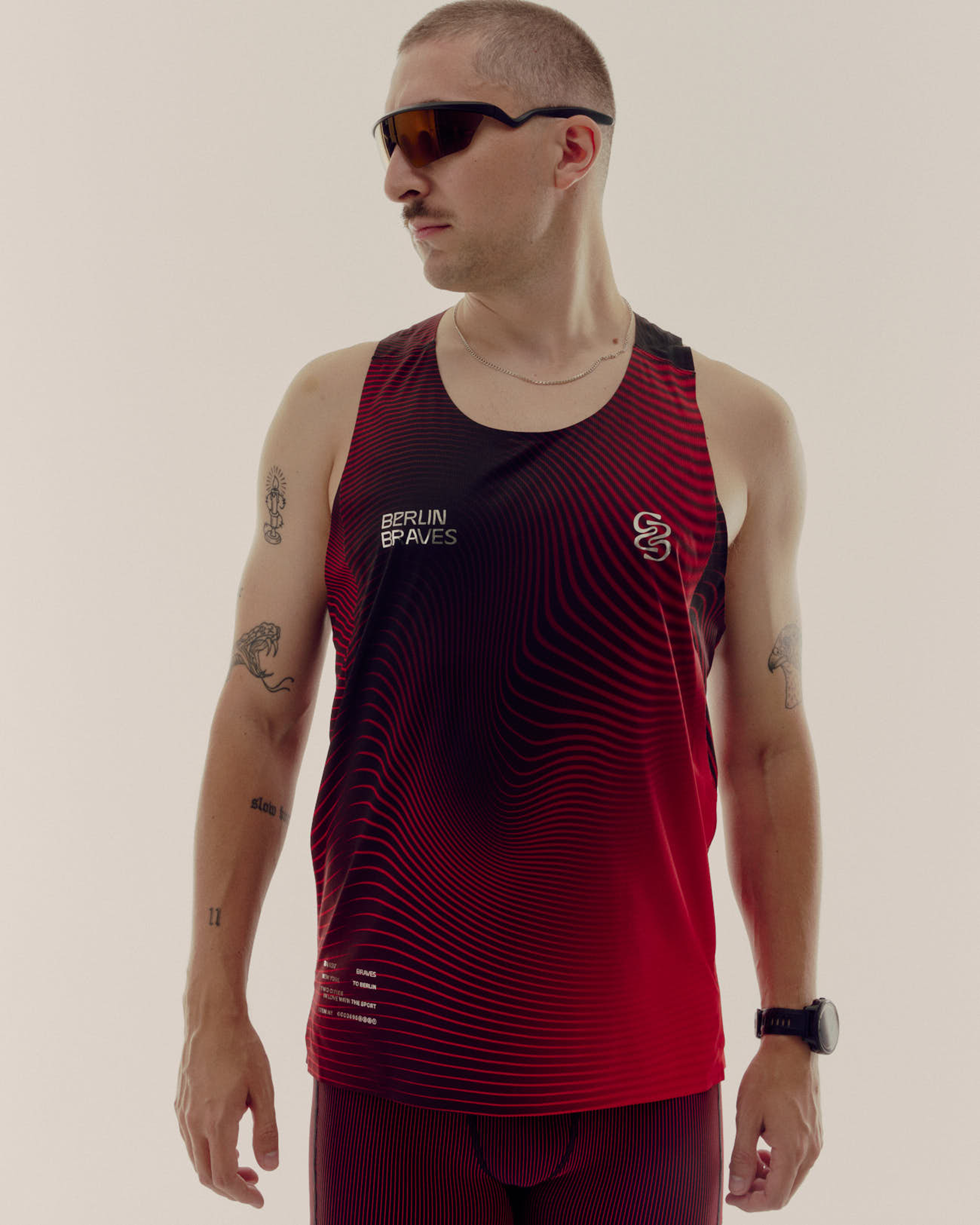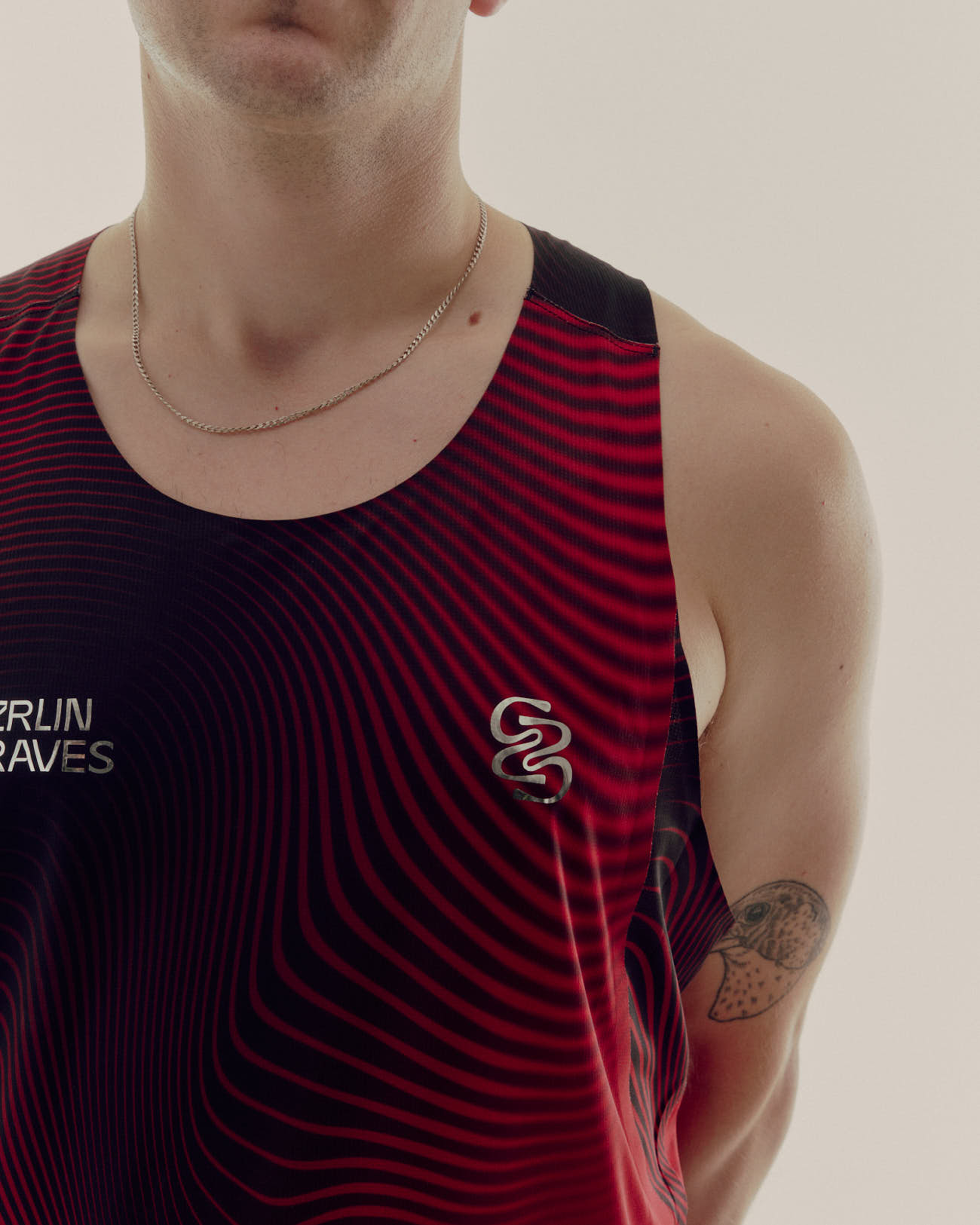 Our Drift™ Racing singlet, now in a limited edition Berlin Braves colorway. Details include narrow straps and racerback for unrestricted range of motion, bonded seams to prevent chafing, side slits for additional mobility, and piecing creating a sleek look. Complete with high contrast chrome Berlin Braves logos left and right chest, right hem, and along center back. Featherweight and airy, Drift™ employs a sophisticated jacquard knit construction creating a micro-textured surface on its reverse side, strategically designed to reduce sticking. The Drift™ singlet keeps you chafe-free and cool. The ultimate racing item, engineered to seamlessly move with your body.