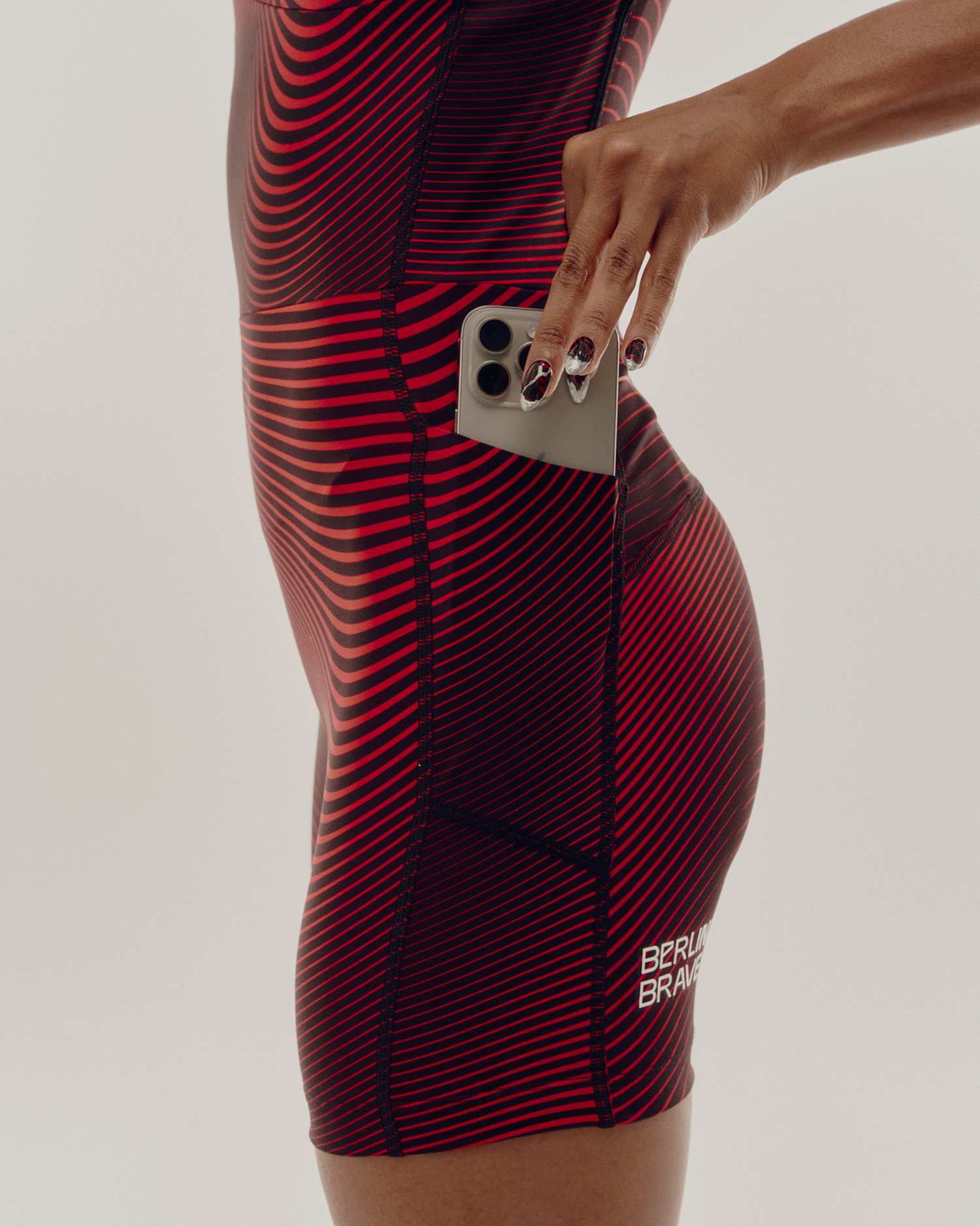 The Stamina™ Square Neck One Piece, now in an exclusive Berlin Braves colorway. This style combines the fit and support of our Stamina™ race crops with the compressive feel of our 5” bottoms. Complete with 5 phone-sized pockets invisible to the naked eye and Italian grip tape at the hem to prevent the legs from riding up. Finished with high contrast chrome Berlin Braves logos on the front and back.