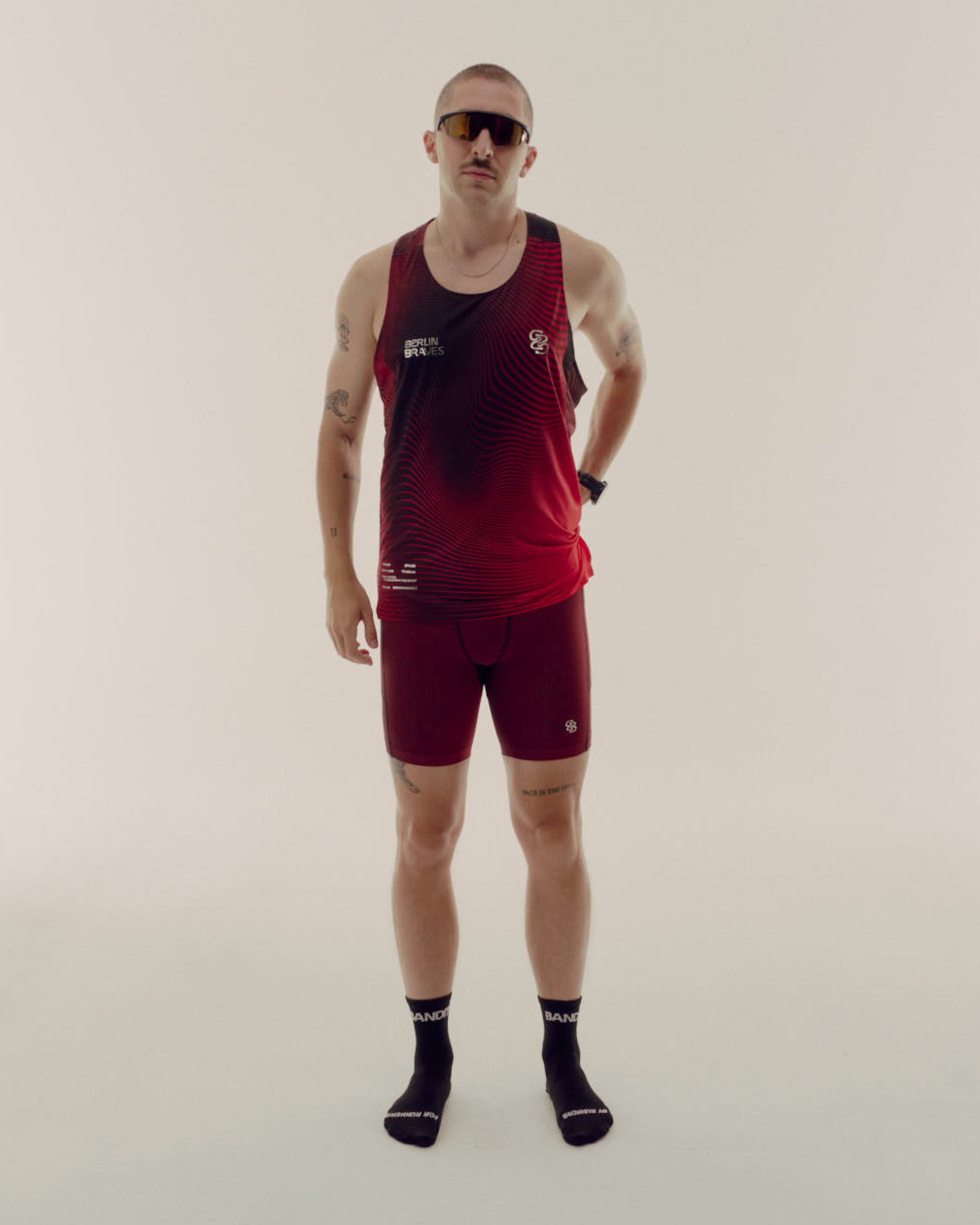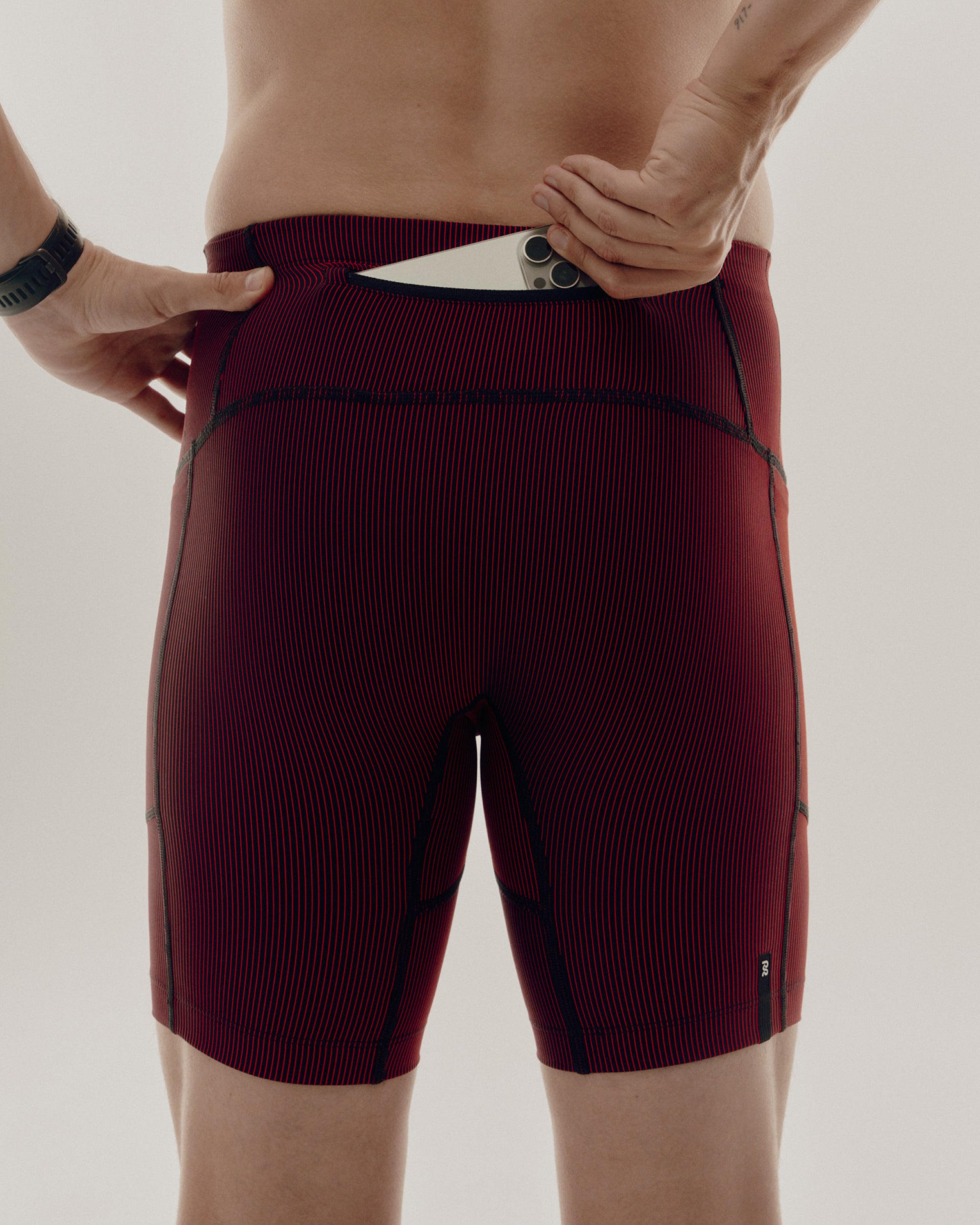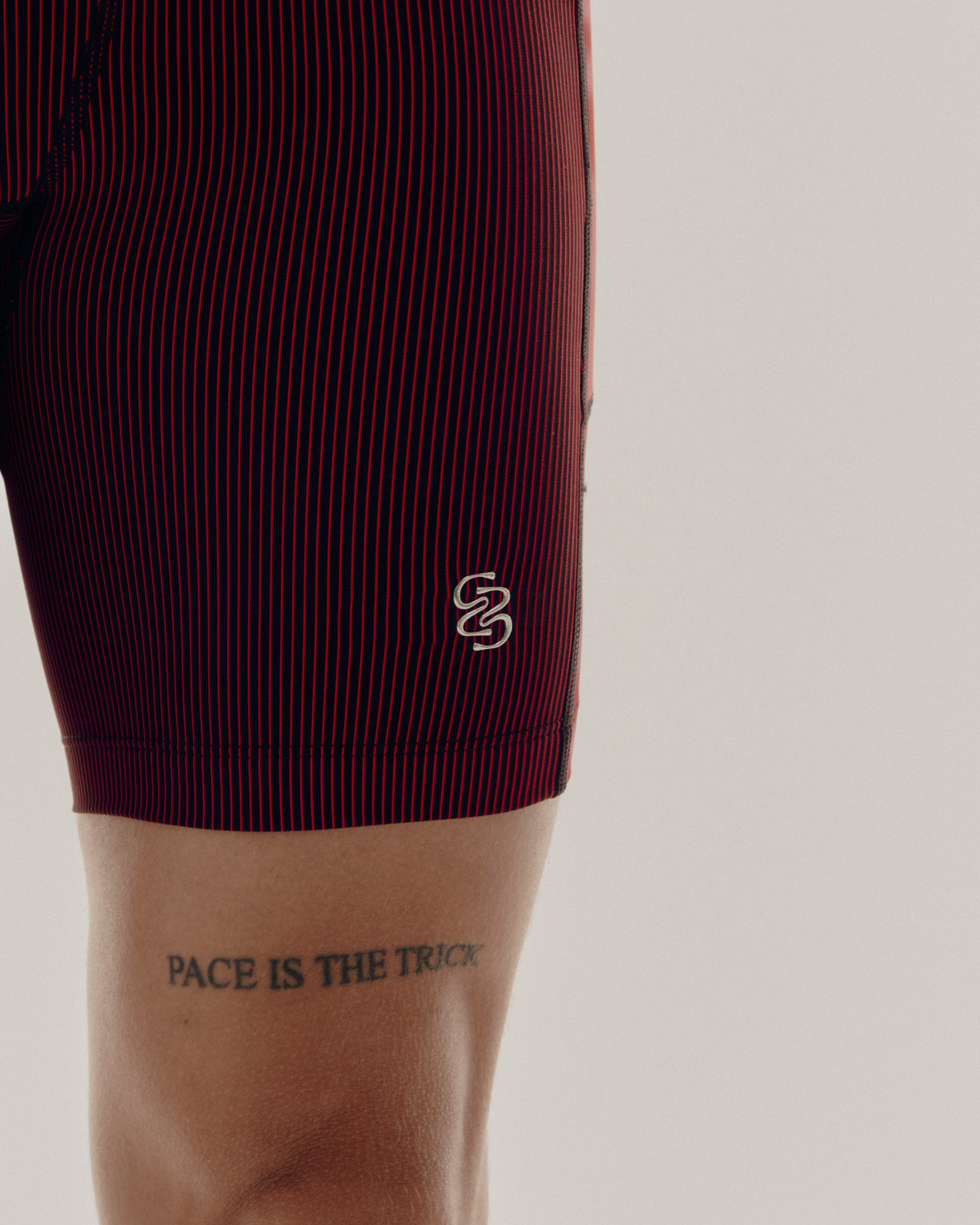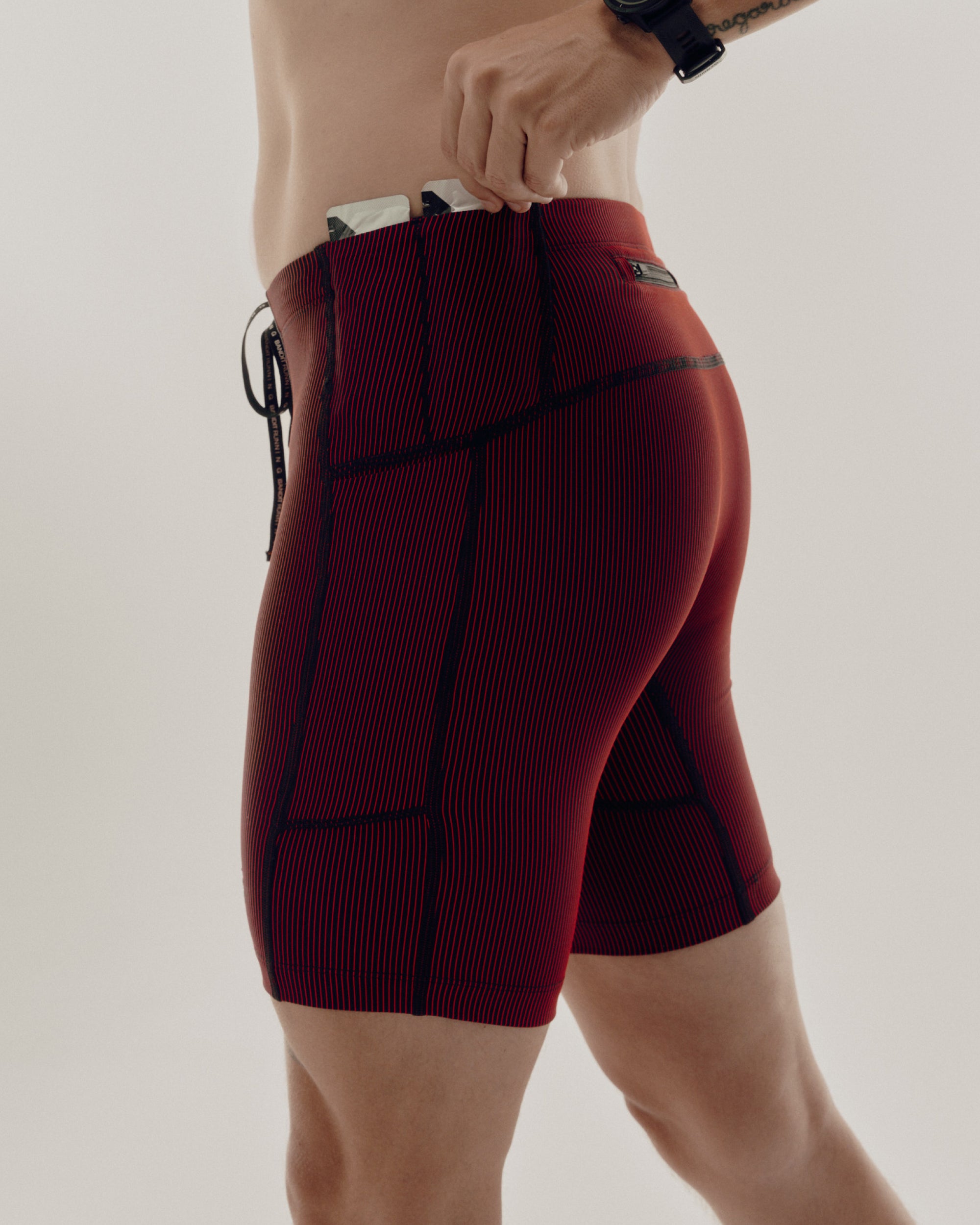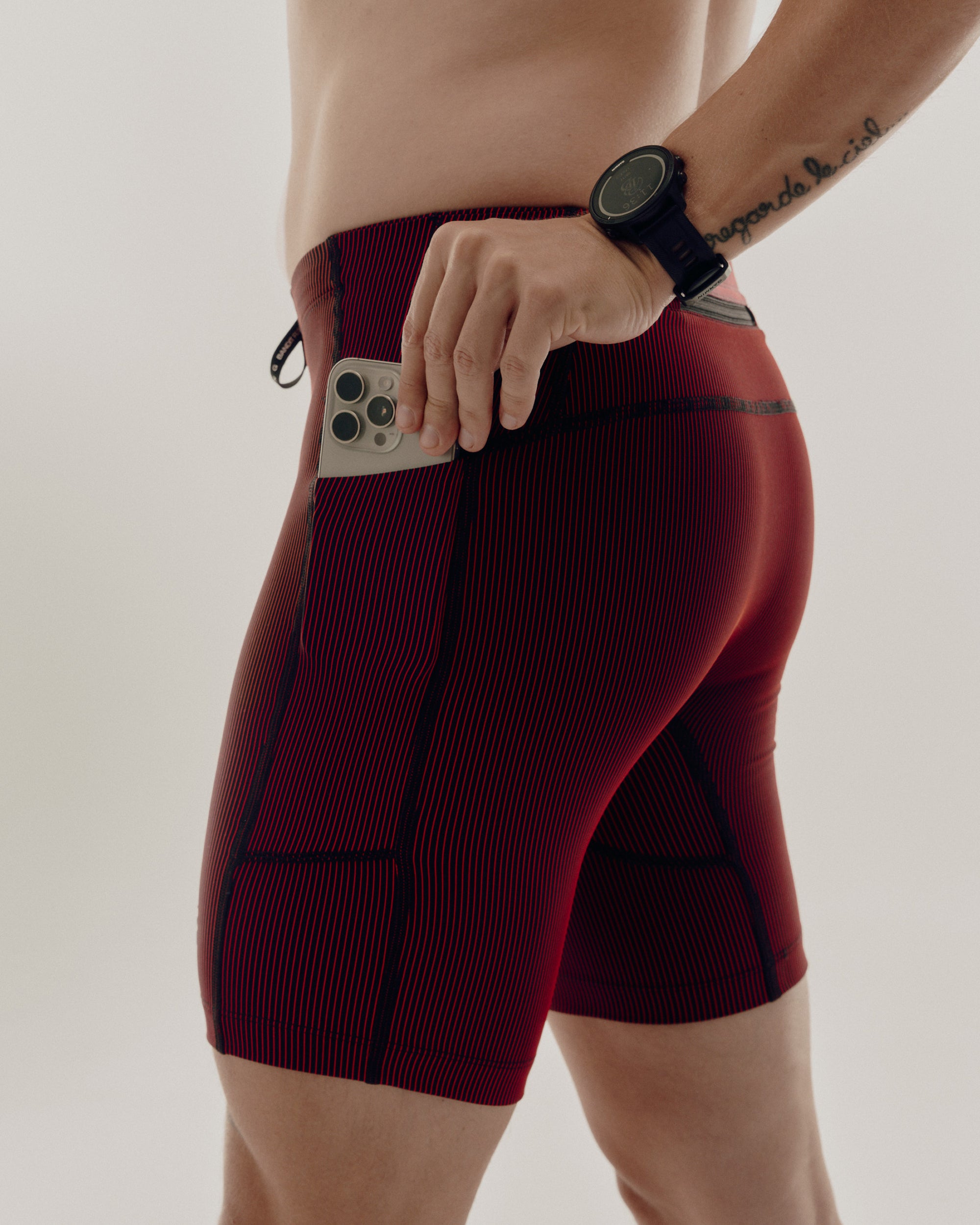 Our classic Striped Cadence™ 7 Pocket Half Tights, now in our exclusive Berlin Braves colorway. Next Gen Half Tight fit, in our ribbed Striped Cadence™ performance fabric with an optimized gusset shape for superior fit. Constructed with 7 total pockets - 2 iPhone-sized at outside thigh with waterproof liner, 4 gel-sized at back waistband, and 1 zippered back stash pocket at back yoke. Grip tape at front and back bottom hem to prevent ride-up without squeezing. Double-layered front fabric for extra coverage. Finished with custom branded drawstring, raised chrome Berlin Braves logo at front left leg and clamp at wearer's right back leg.