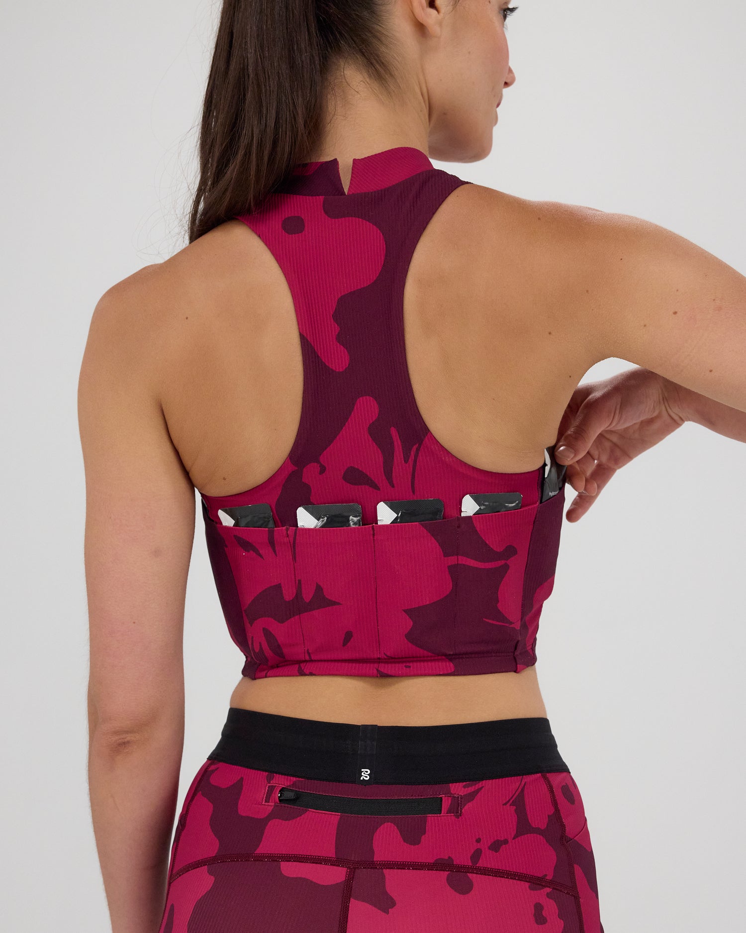 (Note: Video may render dark. Actual color below.) Introducing our Vaso Race Crop, cut in signature Cadence™ fabric. Constructed with a built in bra for a supportive, medium impact fit. The subtle mock neckline and sleek seaming give an elevated aesthetic, while not leaving performance behind. Includes 7 total pockets: 6 gels, 1 phone. Silicone branded patch at center front.