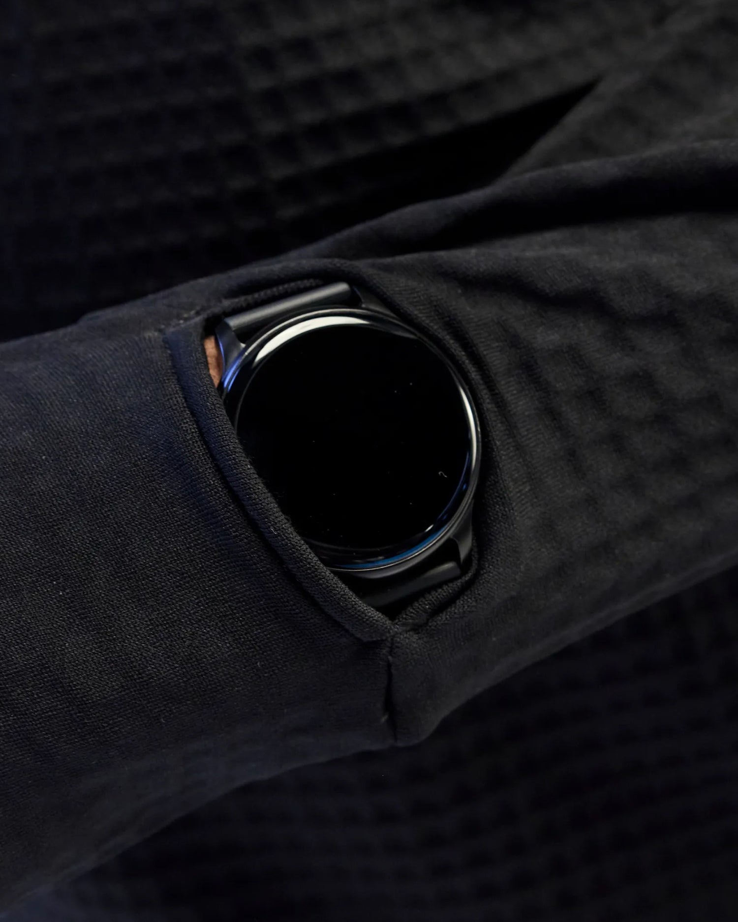 Details include hidden stash pocket at wearer's right side seam, thumbholes, watch window, and internal handwarmer pocket (hand warmers included).