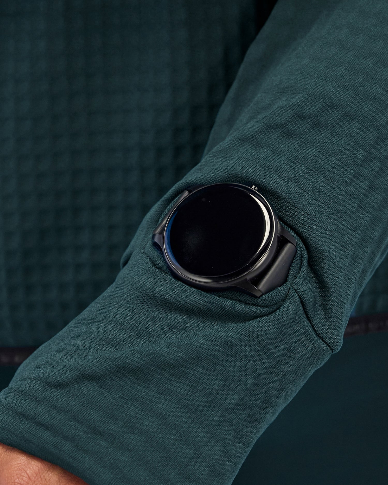 Details include hidden stash pocket at wearer's right side seam, thumbholes, watch window, and internal handwarmer pocket (hand warmers included).