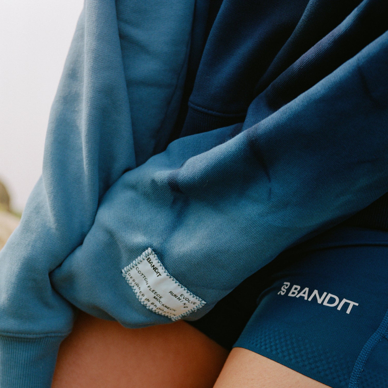 Classic cotton fleece in a shrunken, cropped proportion, uniquely dyed in collaboration with a local Brooklyn artist. Rib trim at mockneck, cuffs, and hem. Embroidered Bandit branding at chest and back hem.
