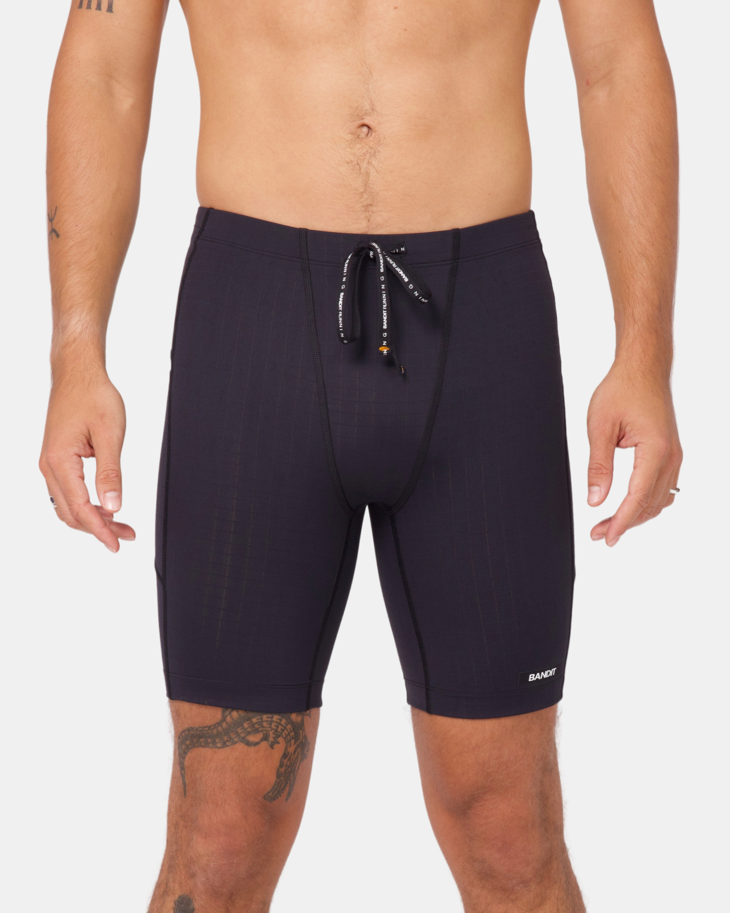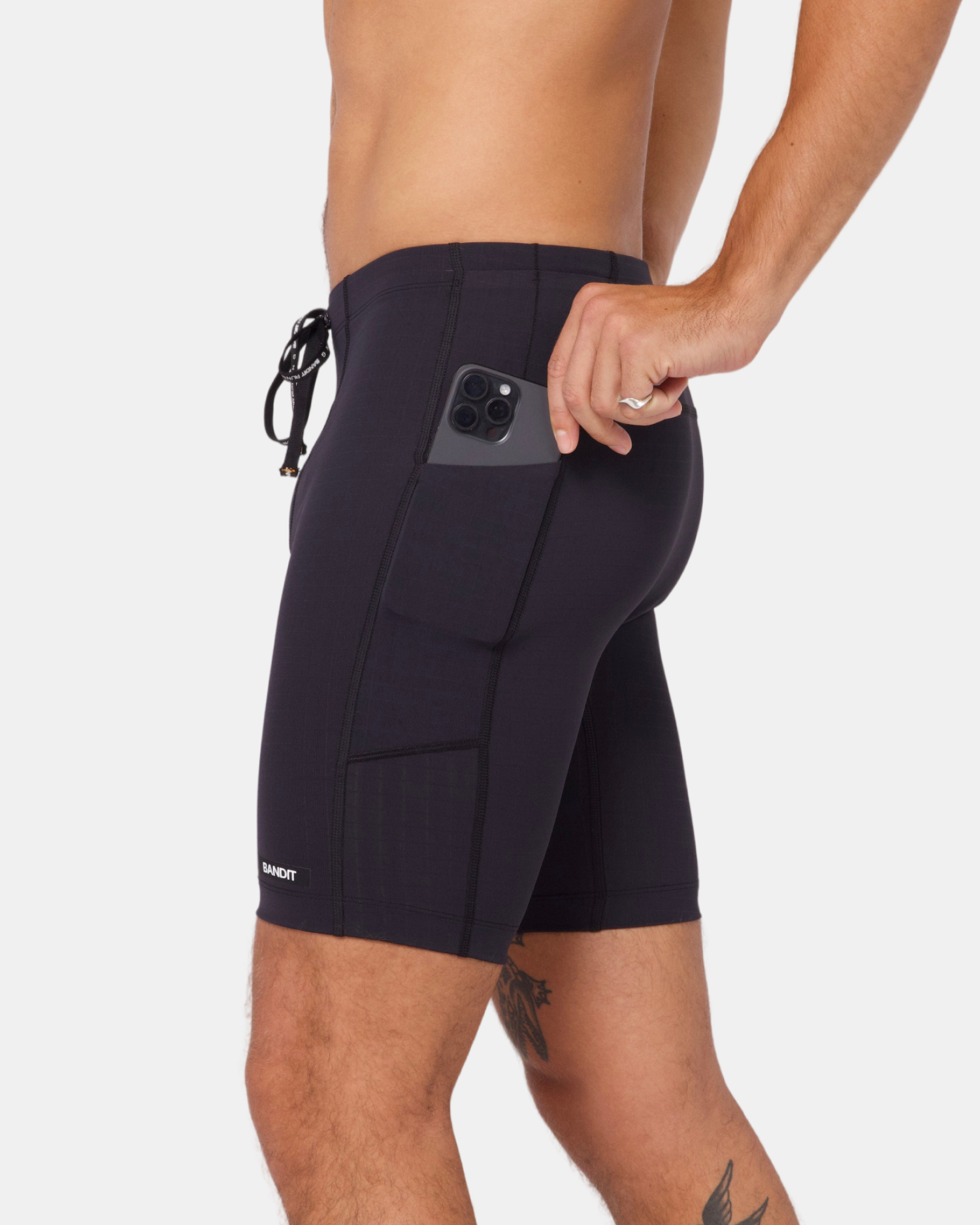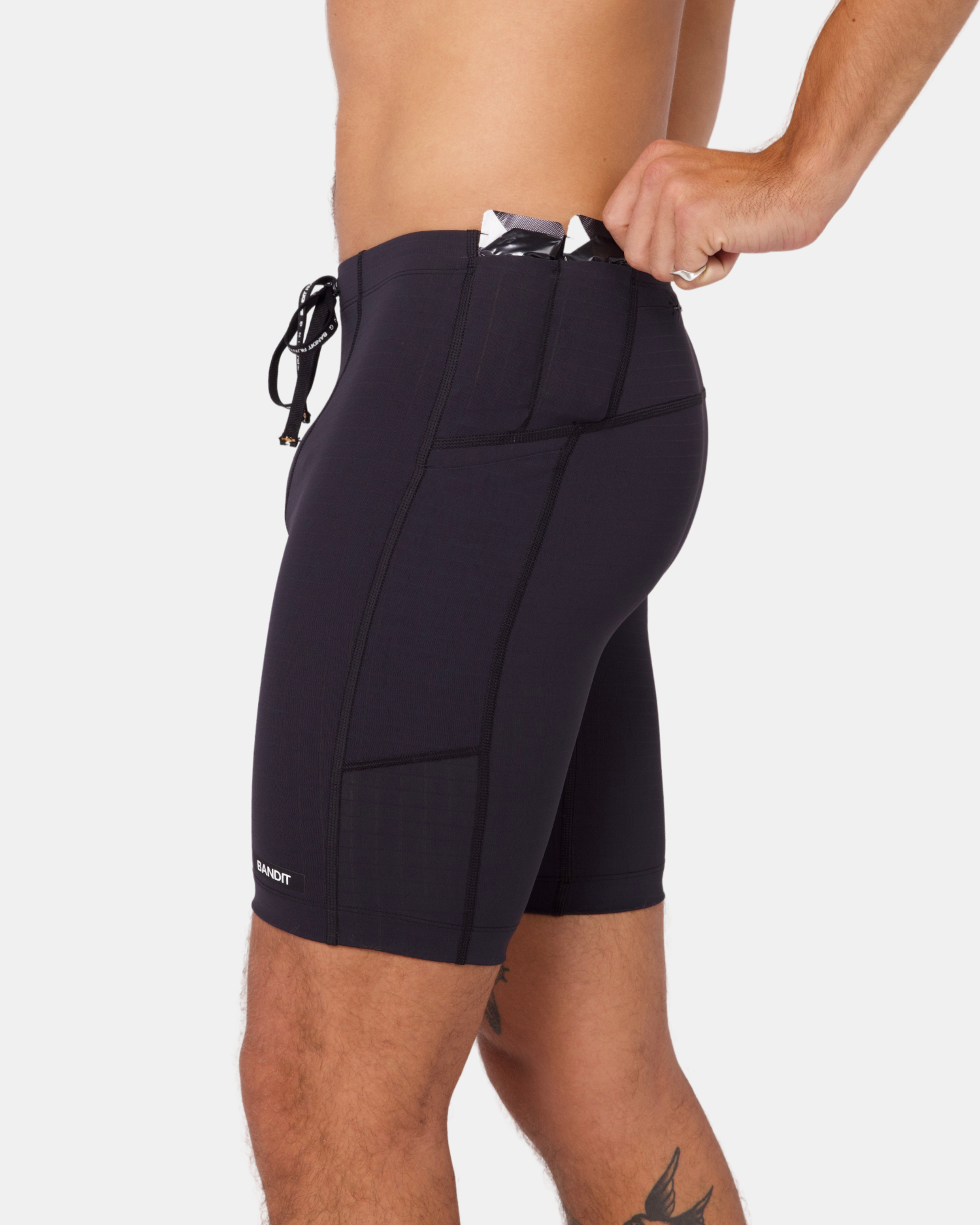 The Next Gen Half Tight in our Gridlock™ fabric, with an optimized gusset, offers 7 pockets: 2 iPhone-sized, 4 gel-sized, 1 zippered stash. Italian grip tape prevents ride-up, with double-layered front fabric, a drawstring, silicone patch and clamp at wearer's right back leg.