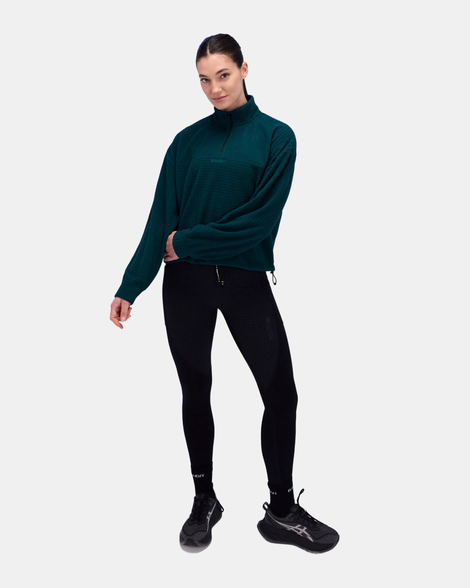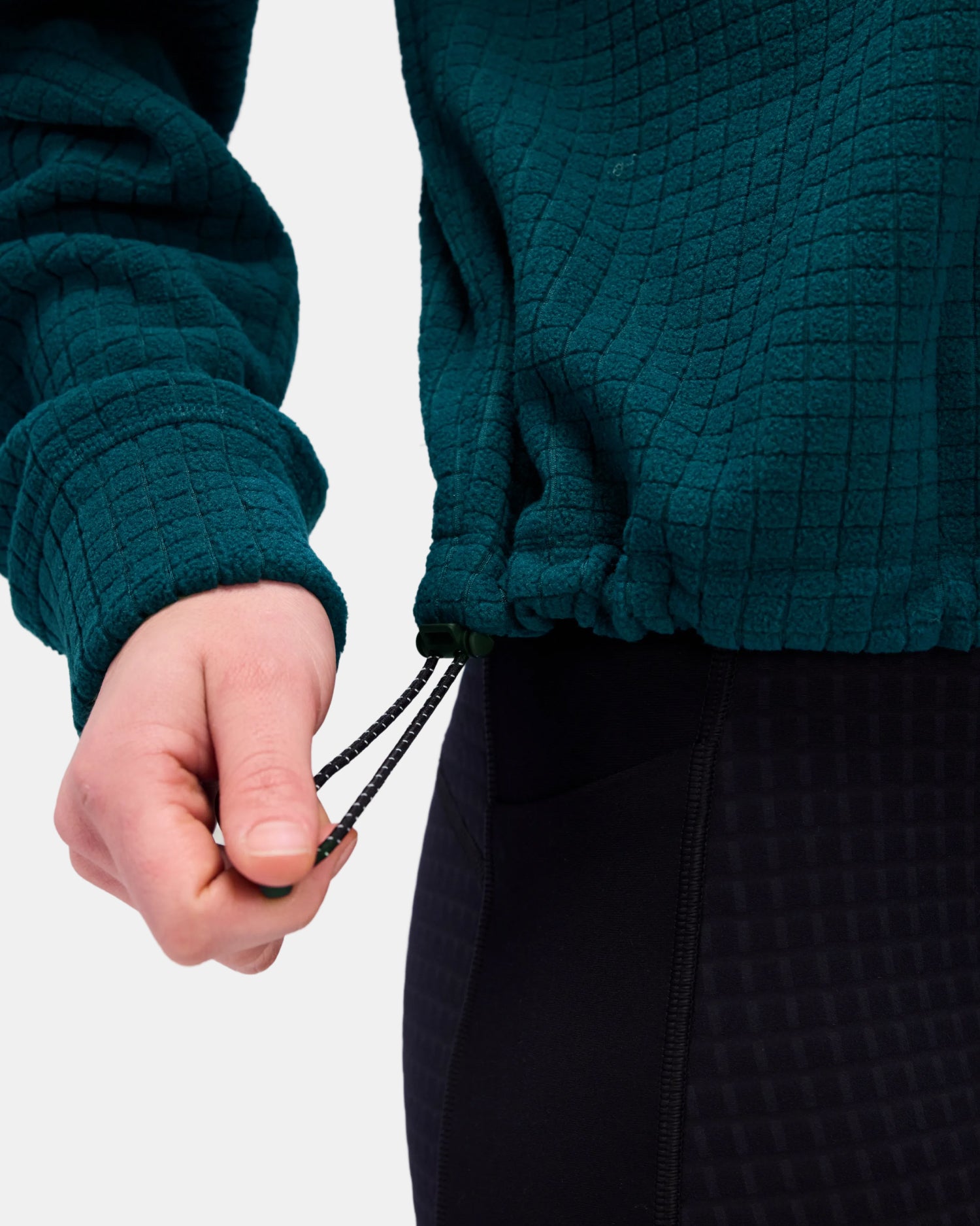 This mockneck style includes a quarter zip detail, as well as bungees and cordstopper at the hem allowing the silhouetted to be cinched to keep cold air out. The relaxed fit and cropped styling is complete with flatlock seaming and embroidered branding at center front and back neck.