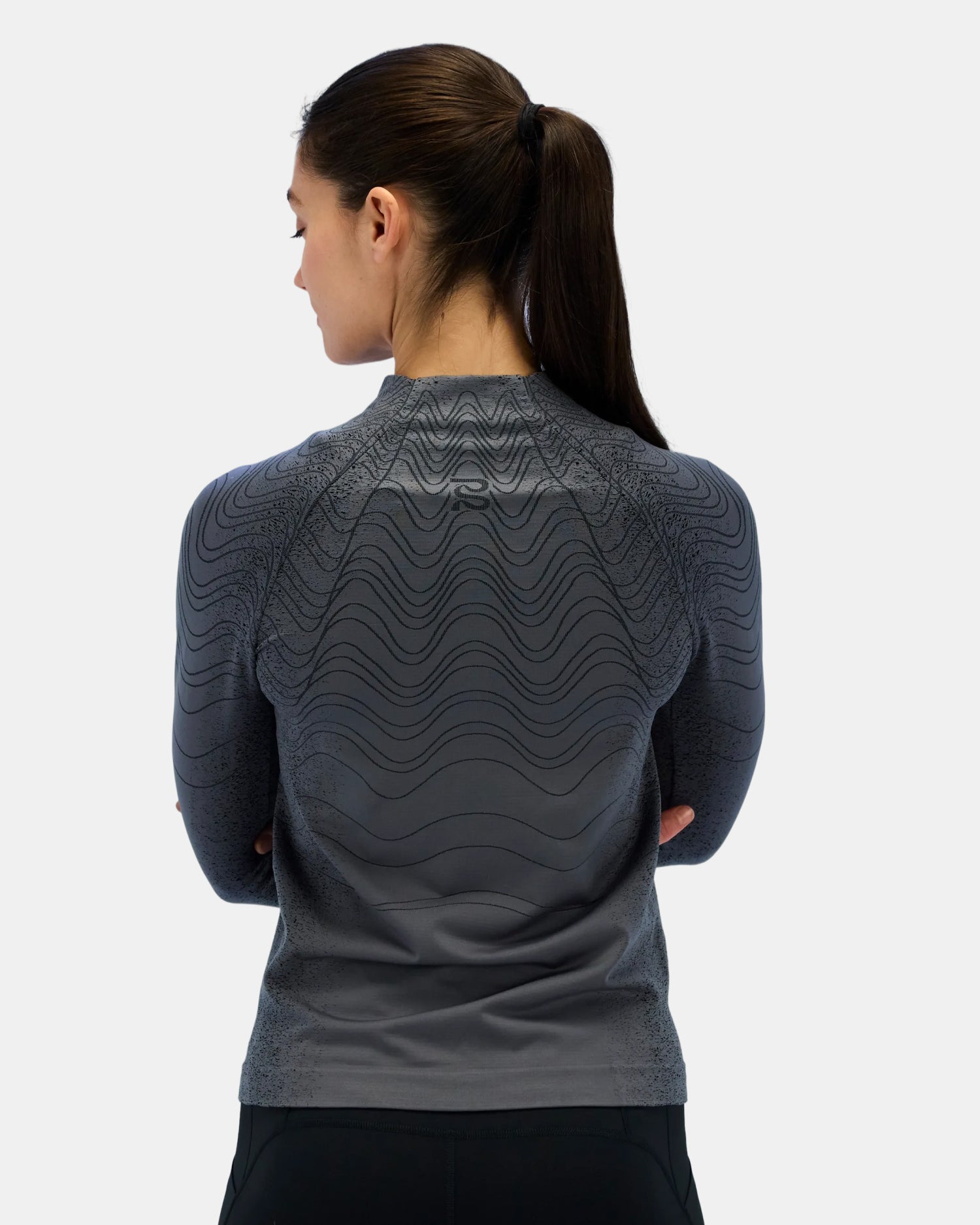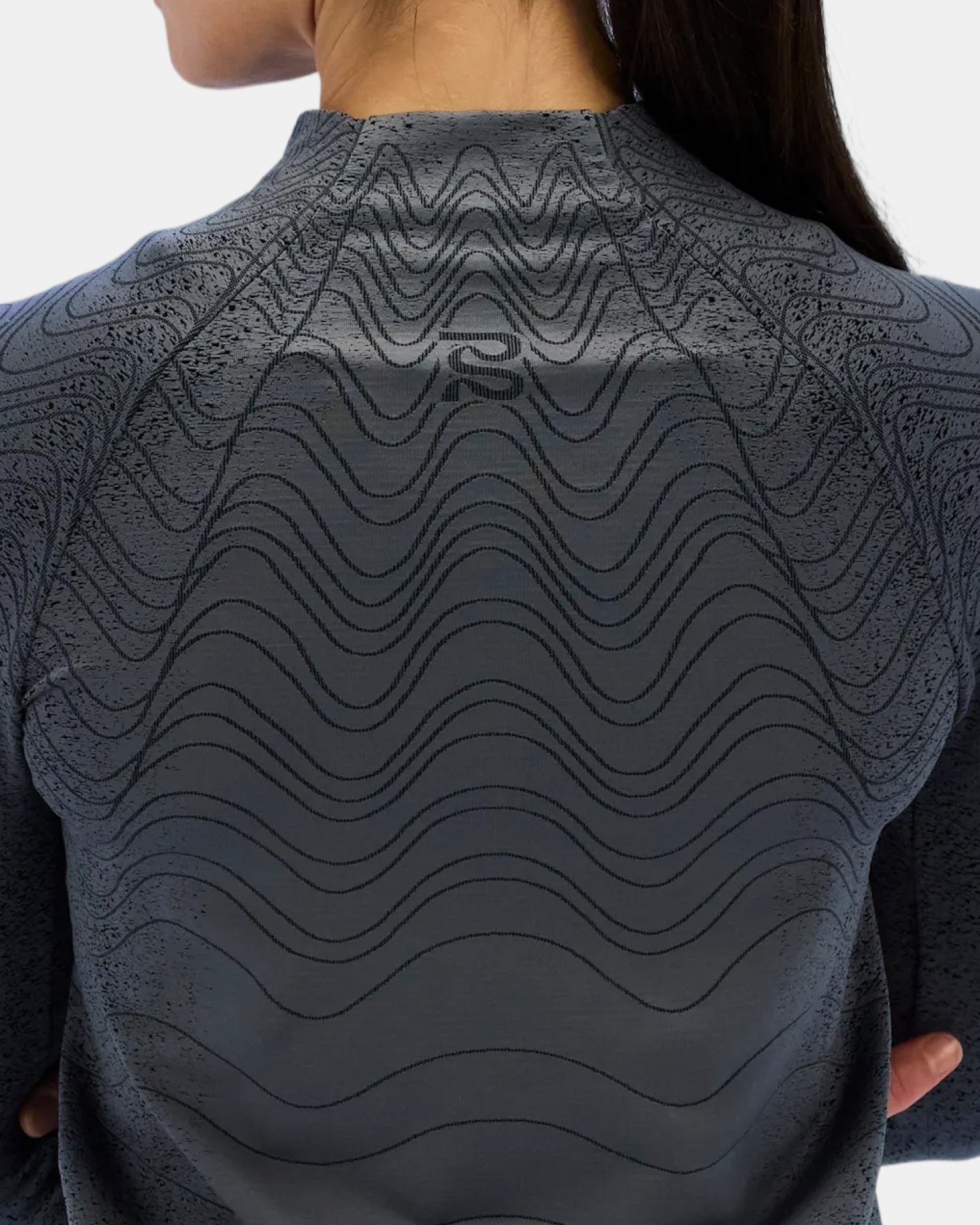 This seamless silhouette is knitted with yarns that create a durable yet soft hand feel with moisture management and quick dry capabilities. Additionally, the carbon fiber knitted throughout helps to regulate the body temperature, while also having anti-static and anti-microbial properties.