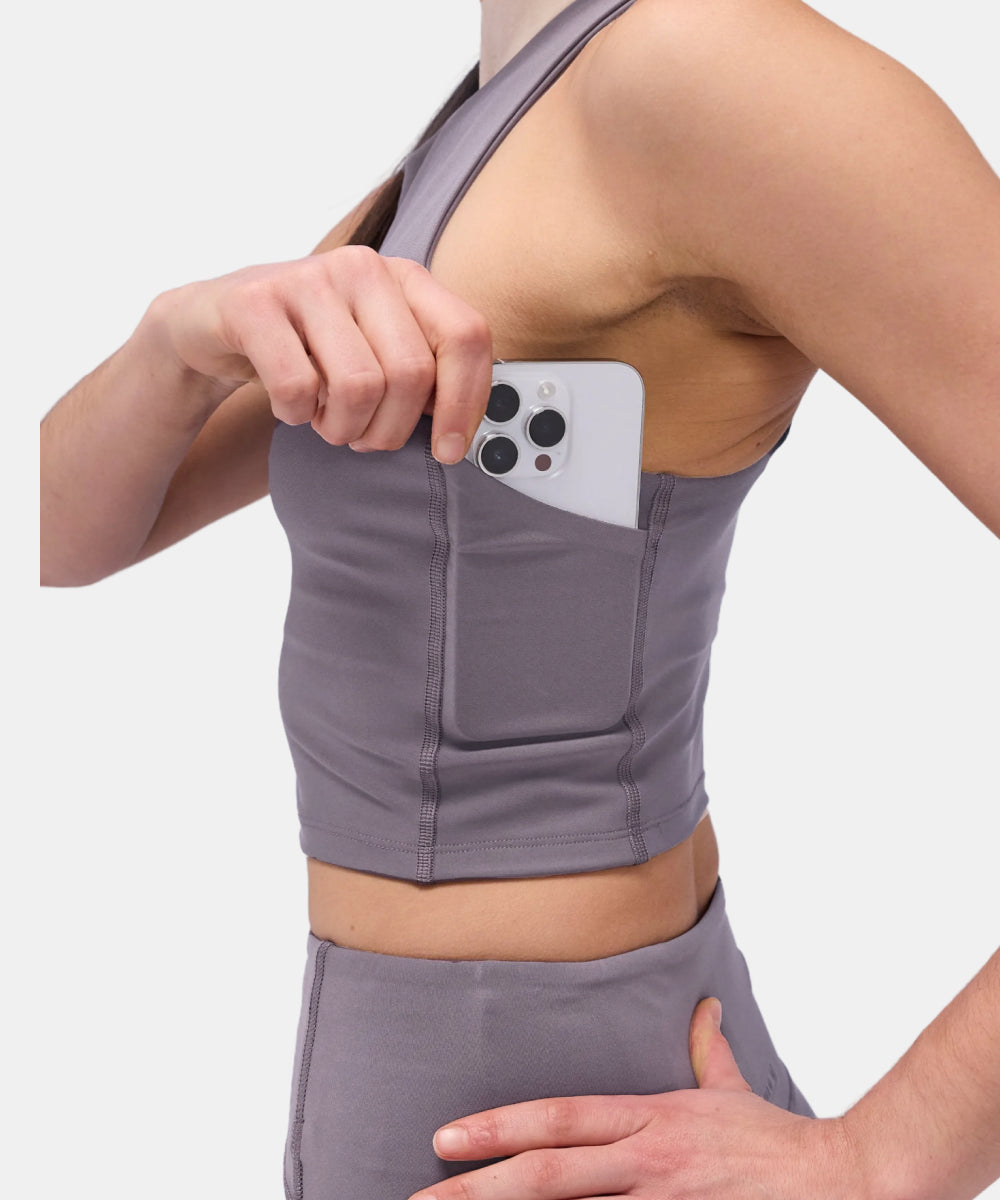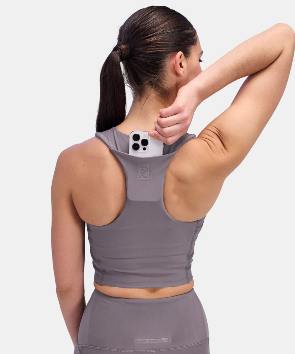 Multiple pockets, zero telling. Sweat-proof phone and gel-sized pockets all designed to disappear when you run.