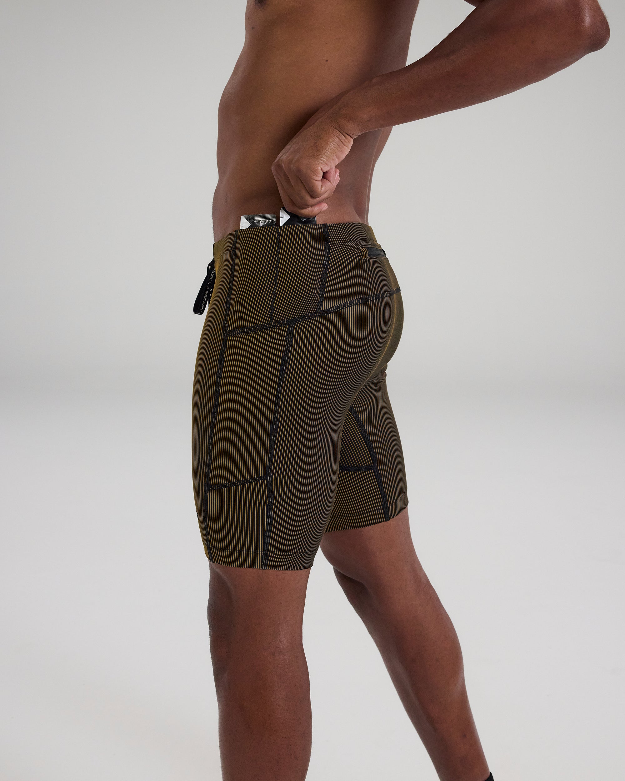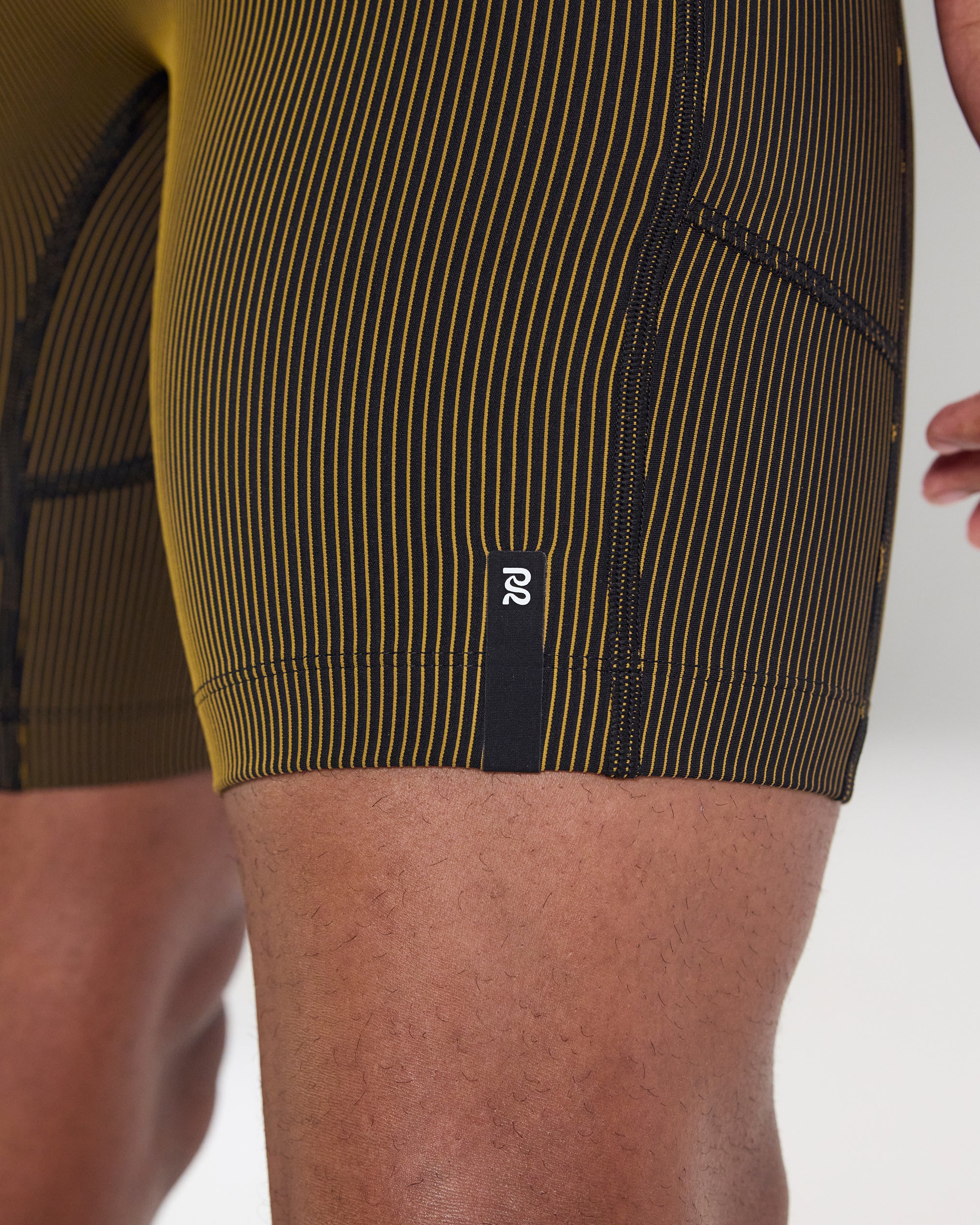 (Note: Video may render dark. Actual color below.) Our classic Next Gen Half Tight fit, in our new ribbed Striped Cadence™ performance fabric with an optimized gusset shape for superior fit. Constructed with 7 total pockets - 2 phone pockets at outside thigh with waterproof liner, 4 gel pockets at back waistband, and 1 zippered back stash pocket at back yoke. Grip tape at front and back bottom hem to prevent ride-up without squeezing. Double-layered front fabric for extra coverage. Finished with custom branded drawstring, silicone branding patch at front left leg and camp at wearer's right back leg. New Fall '25 colorway.