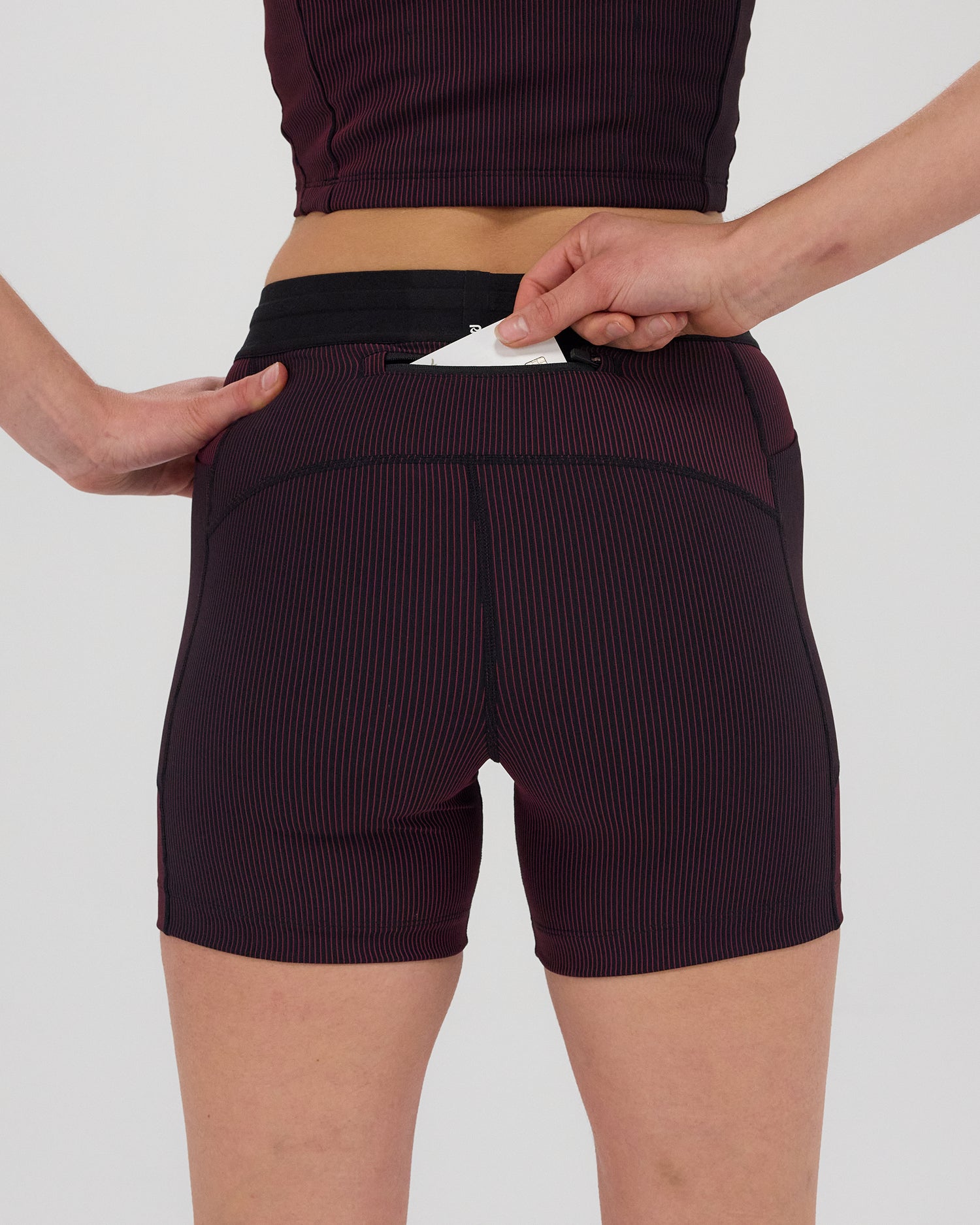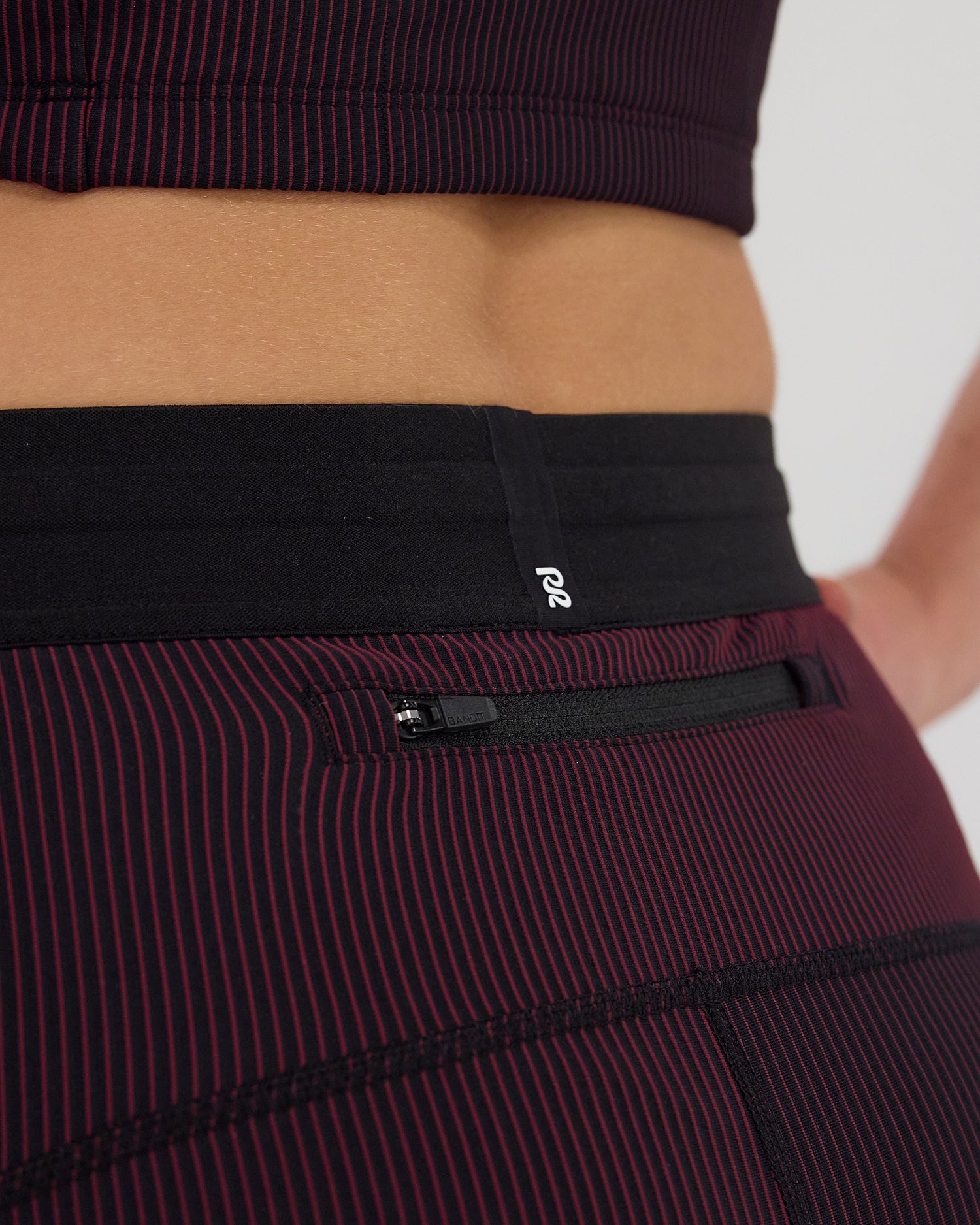 (Note: Video may render dark. Actual color below.) Crafted in our ultra comfortable Striped Cadence™ performance fabric, the 5" compression bottoms have no front rise seam and are complete with 2 waterproof phone pockets on the sides and 1 zipper stash pocket at the center-back. Finished with Italian grip tape at the hem to prevent ride-up, our custom anti-chafing waistband, and subtle silicone logo detailing.