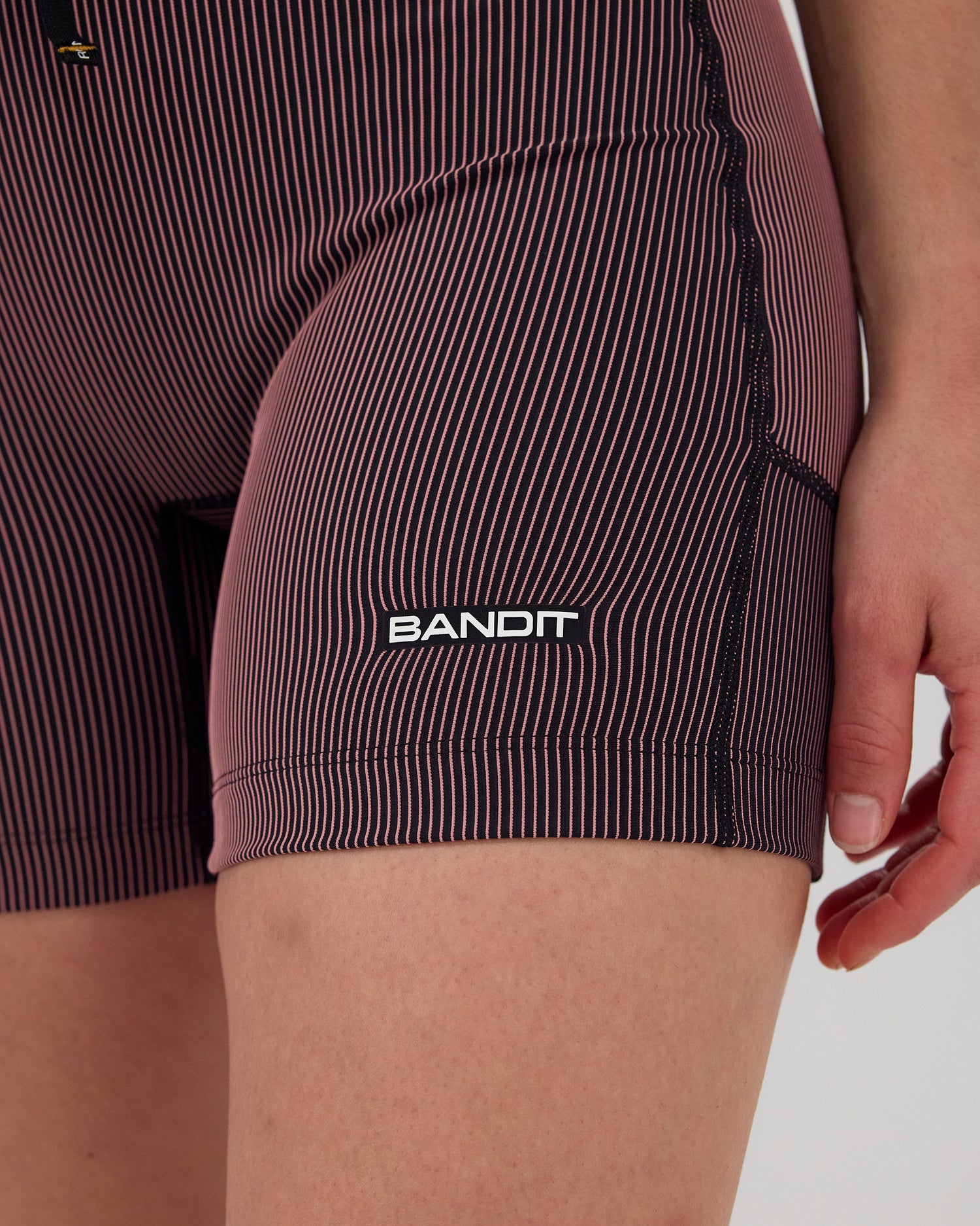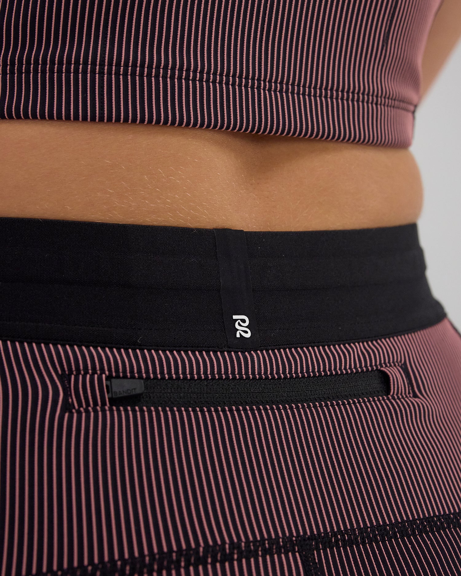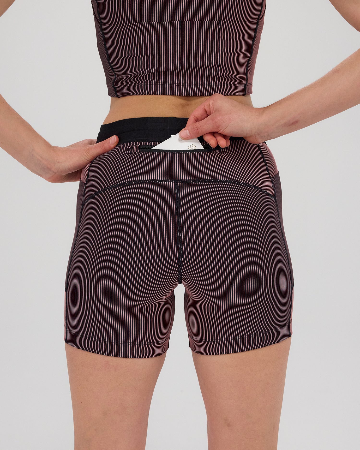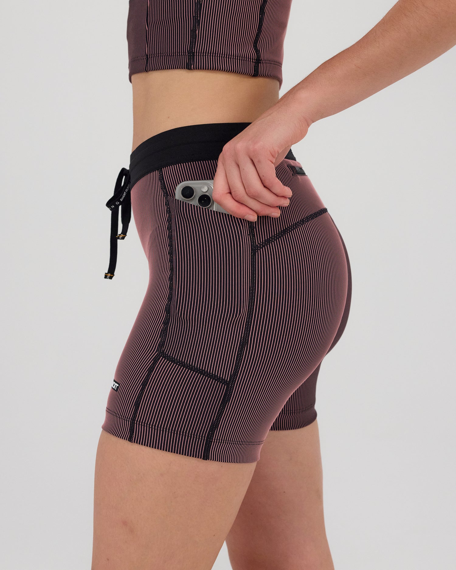 (Note: Video may render dark. Actual color below.) Crafted in our ultra comfortable Striped Cadence™ performance fabric, the 5" compression bottoms have no front rise seam and are complete with 2 waterproof phone pockets on the sides and 1 zipper stash pocket at the center-back. Finished with Italian grip tape at the hem to prevent ride-up, our custom anti-chafing waistband, and subtle silicone logo detailing.