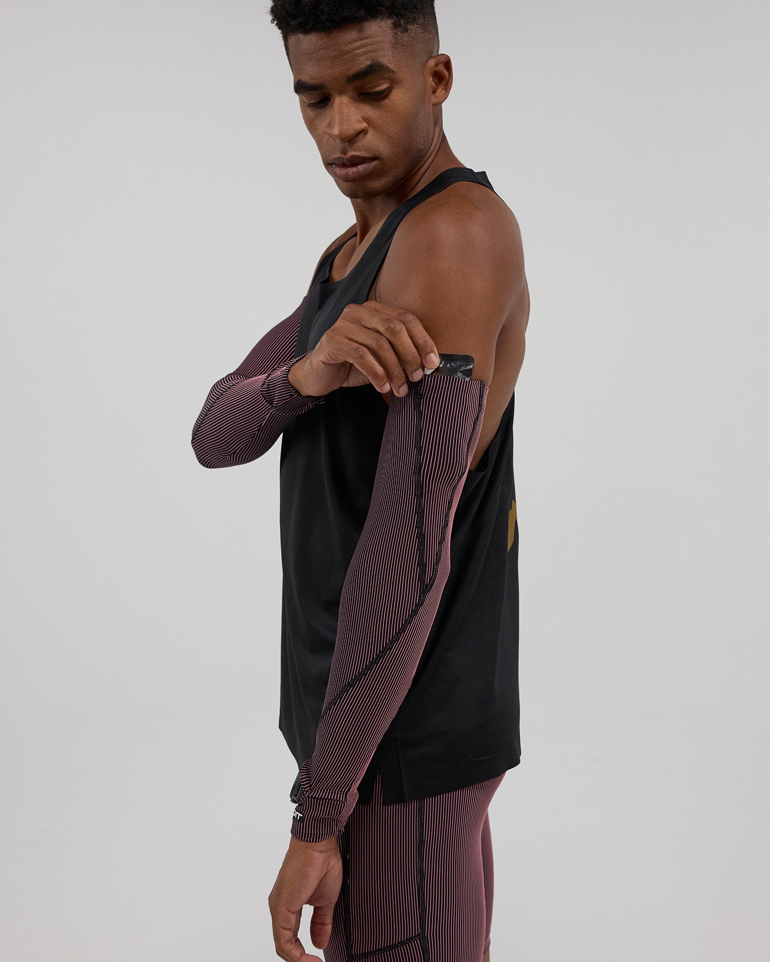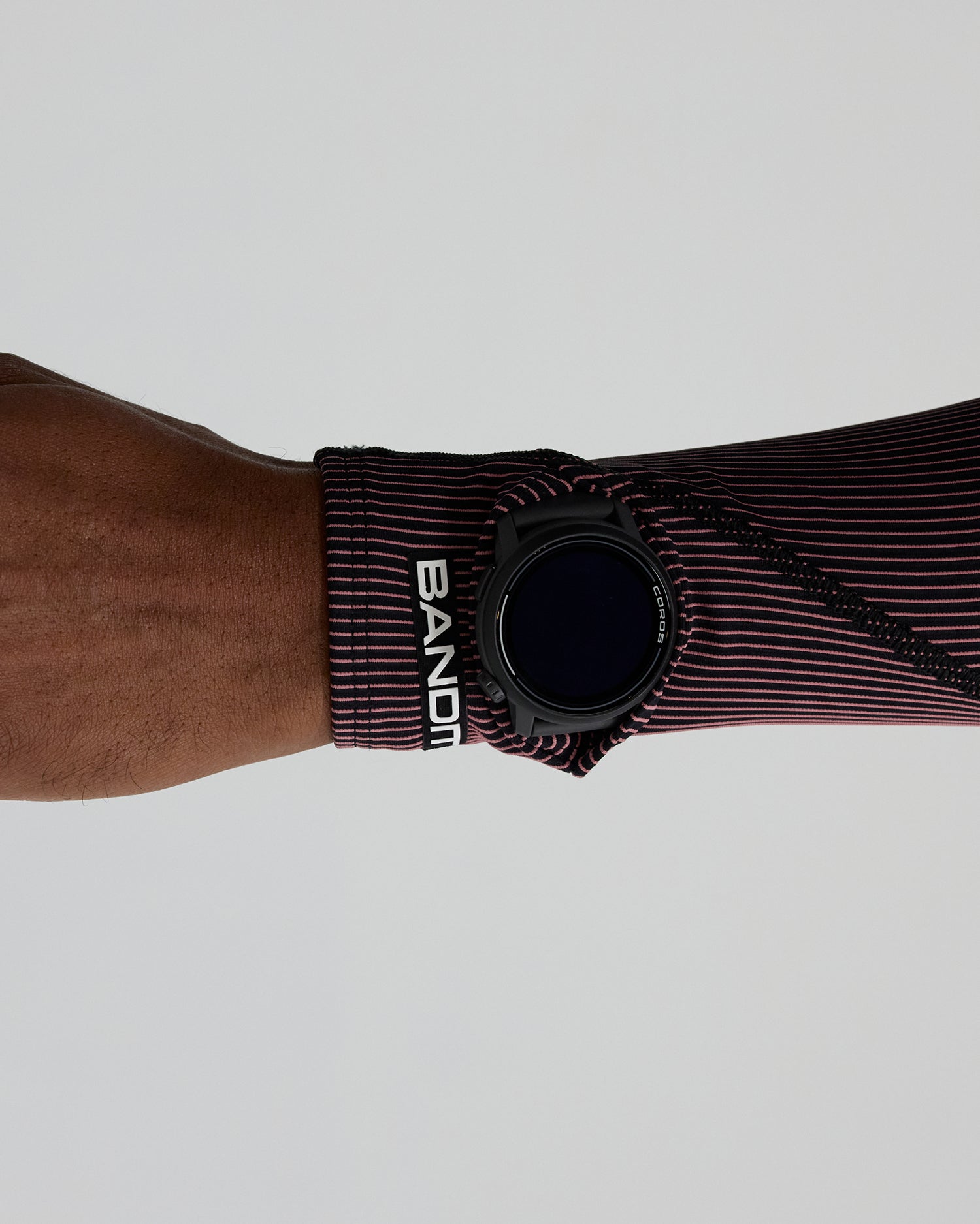 (Note: Video may render dark. Actual color below.) An evolution of our original compression sleeves, now made in our compressive Striped Cadence™ fabric. Length stops at wrist and includes a watch windows and gel pockets on both sleeves with a silicone patch above sleeve opening.