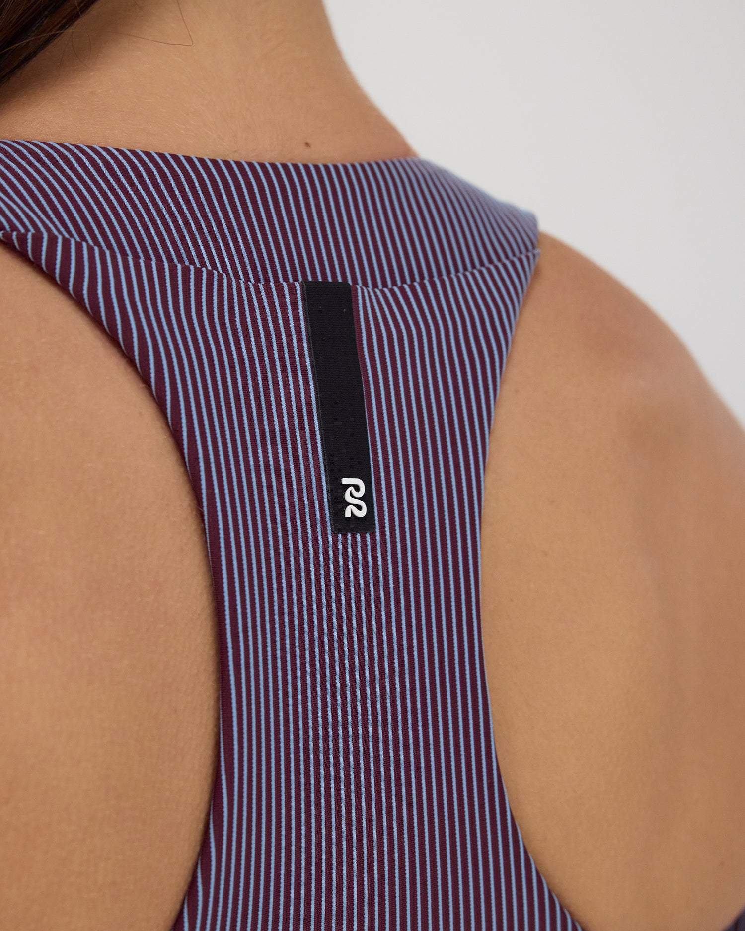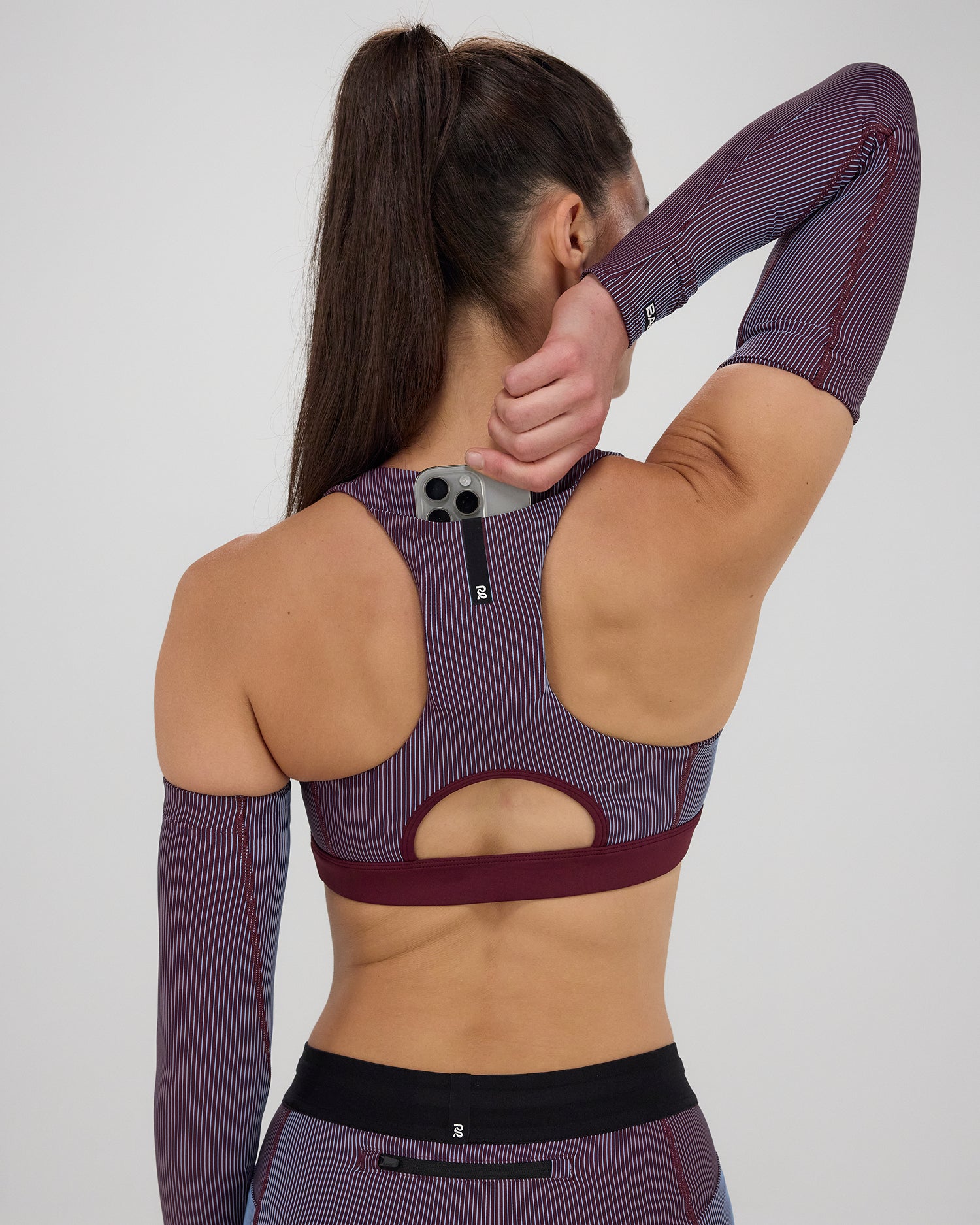 (Note: Video may render dark. Actual color below.) Our signature Scoop Neck Run Bra silhouette in Striped Cadence™ Performance Knit. Engineered for maximum versatility with 3 pockets: 2 for gels under each arm, 1 for iPhone at center-back with waterproof liner. The double layer construction provides a supportive, medium impact fit. Bottom hem is blocked in Stamina creating a textural and visual contrast. Silicone logo at front with branded clamp at back pocket.