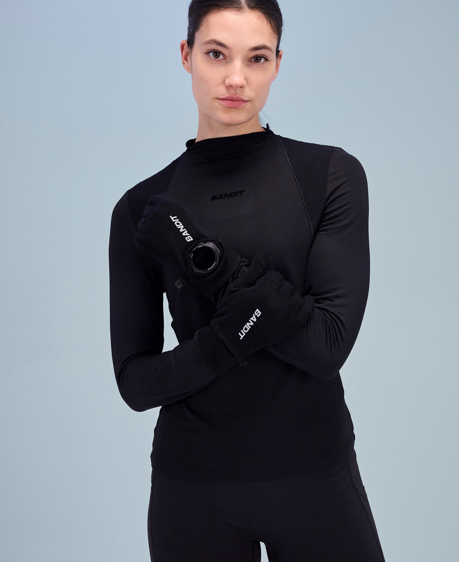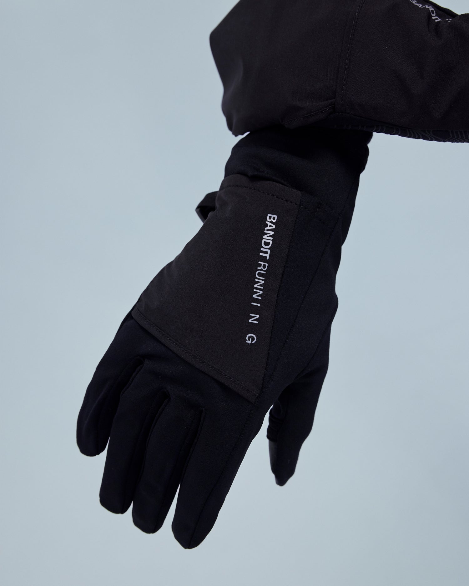 A fresh take on last year's performance gloves, now updated in a merino wool performance fabric. Silicone grip detail in seasonal custom pattern at the palm. Additionally touch screen friendly fabric at the thumb and fore fingers, with an added hatch opening for ease of accessibility, The watch window returns, making this the ultimate training glove. Reflective branding along front seam. Hem finished with elastic binding. Clip detail at side seam ensures this pair isn't easily separated.